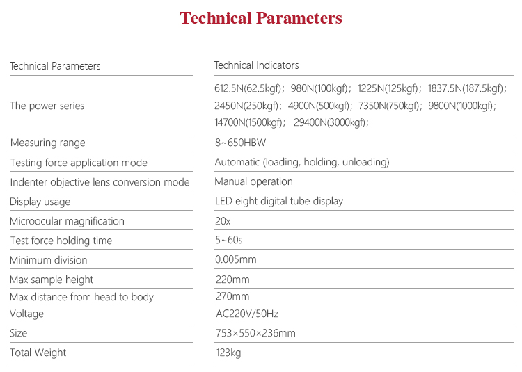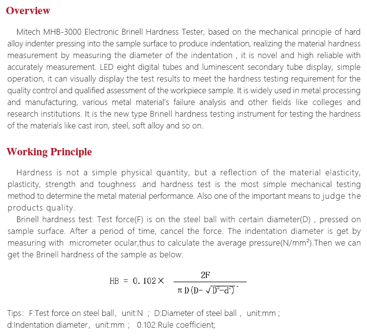 Mitech MHB-3000 Electronic Brinell Hardness Tester, based on the mechanical principle of hard alloy indenter pressing into the sample surface to produce indentation, realizing the material hardness measurement by measuring the diameter of the indentation , it is novel and high reliable with accurately measurement. LED eight digital tubes and luminescent secondary tube display, simple operation, it can visually display the test results to meet the hardness testing requirement for the quality control and qualified assessment of the workpiece sample. It is widely used in metal processing and manufacturing, various metal material’s failure analysis and other fields like colleges and research institutions. It is the new type Brinell hardness testing instrument for testing the hardness of the materials like cast iron, steel, soft alloy and so on.