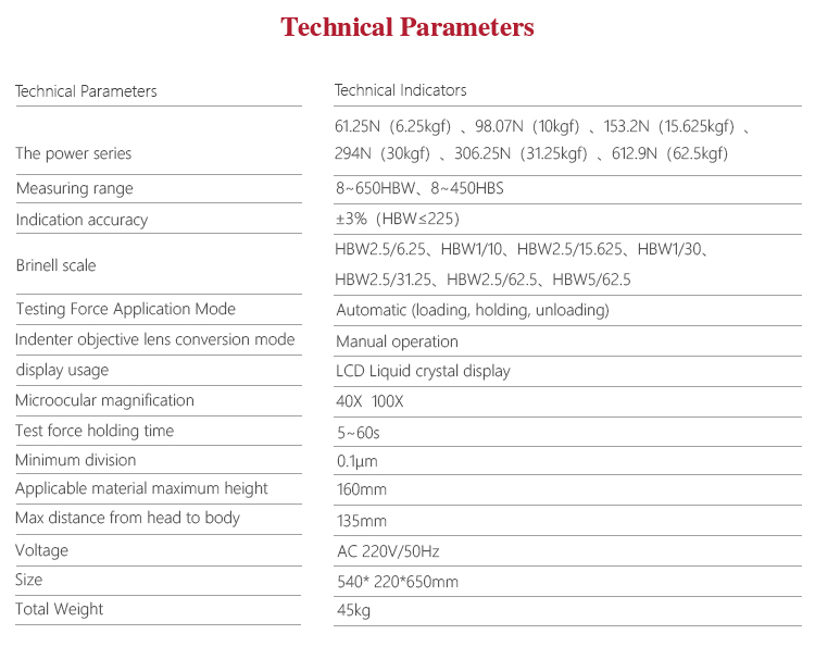 | Brinell scale | HBW2.5/6.25、HBW1/10、HBW2.5/15.625、HBW1/30、 HBW2.5/31.25、HBW2.5/62.5、HBW5/62.5 |