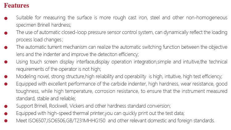 | Brinell scale | HBW2.5/62.5、HBW2.5/187.5、HBW5/125、HBW5/250、 HBW5/750、HBW10/100、HBW10/1500、HBW10/3000、 HBW10/250、HBW1 |