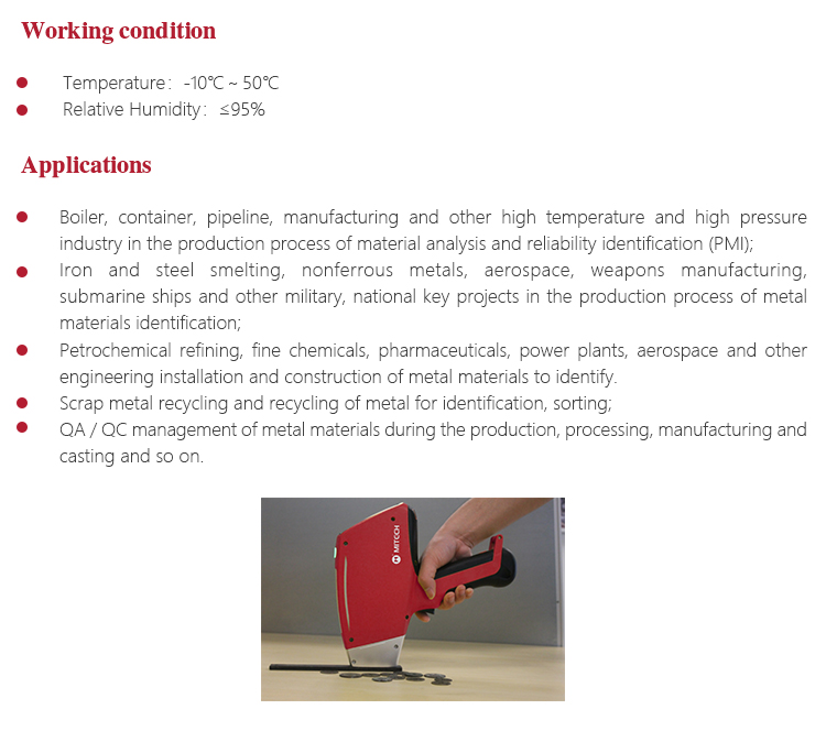Product OverviewMITECH MAS800 Portable spectrometer, also called alloy analyzer. It adopts the principle of energy and wavelength differences in X-ray generated by metal atoms when energy level flips, so as to analysis element type and content in alloy material. Small size and light weight makes it convenient to work on site. It is easy to operate without tricky skills. A variety of elemental content can be measured at once in solid/powder/liquid sample detection. It is also designed with low consumption, high speed analysis and high accuracy; widely used in the field of analysis of elements such as boiler containers, petrochemical refining, iron and steel smelting, nonferrous metals, aerospace, weapons manufacturing and other elements that need to analyze Na or above to U. MAS 800 is a necessary professional precision instrument to improve the production efficiency and pass rate as well as cost savings.