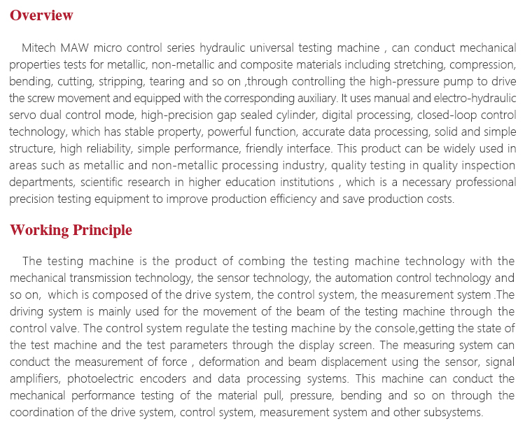 Product OverviewMitech MAW micro control series hydraulic universal testing machine , can conduct mechanical properties tests for metallic, non-metallic and composite materials including stretching, compression, bending, cutting, stripping, tearing and so on ,through controlling the high-pressure pump to drive the screw movement and equipped with the corresponding auxiliary. It uses manual and electro-hydraulic servo dual control mode, high-precision gap sealed cylinder, digital processing, closed-loop control technology, which has stable property, powerful function, accurate data processing, solid and simple structure, high reliability, simple performance, friendly interface. This product can be widely used in areas such as metallic and non-metallic processing industry, quality testing in quality inspection departments, scientific research in higher education institutions , which is a necessary professional precision testing equipment to improve production efficiency and save production costs.