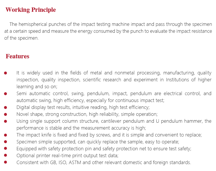 Working PrincipleThe hemispherical punches of the impact testing machine impact and pass through the specimen at a certain speed and measure the energy consumed by the punch to evaluate the impact resistance of the specimen.