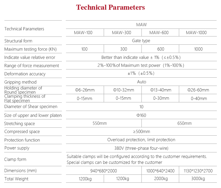 Product OverviewMitech MAW micro control series hydraulic universal testing machine , can conduct mechanical properties tests for metallic, non-metallic and composite materials including stretching, compression, bending, cutting, stripping, tearing and so on ,through controlling the high-pressure pump to drive the screw movement and equipped with the corresponding auxiliary. It uses manual and electro-hydraulic servo dual control mode, high-precision gap sealed cylinder, digital processing, closed-loop control technology, which has stable property, powerful function, accurate data processing, solid and simple structure, high reliability, simple performance, friendly interface. This product can be widely used in areas such as metallic and non-metallic processing industry, quality testing in quality inspection departments, scientific research in higher education institutions , which is a necessary professional precision testing equipment to improve production efficiency and save production costs.