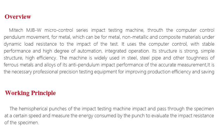 Product OverviewMitech MJB-W micro-control series impact testing machine, throuth the computer control pendulum movement, for metal, which can be for metal, non-metallic and composite materials under dynamic load resistance to the impact of the test. It uses the computer control, with stable performance and high degree of automation, integrated operation. Its structure is strong, simple structure, high efficiency. The machine is widely used in steel, steel pipe and other toughness of ferrous metals and alloys of its anti-pendulum impact performance of the accurate measurement,It is the necessary professional precision testing equipment for improving production efficiency and saving production costs.