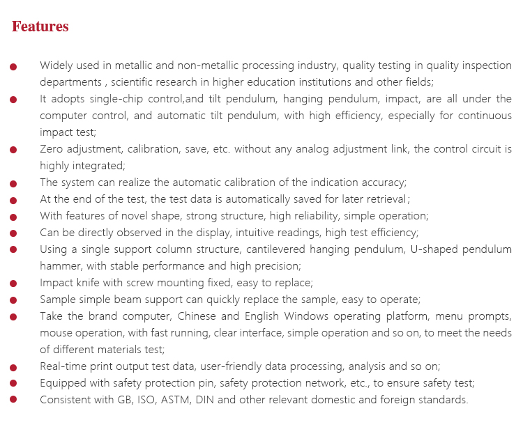 Function & applicationIt is widely used in the accurate determination of pendulum impact resistance of ferrous metals and alloy materials, such as steel, steel pipe, etc..