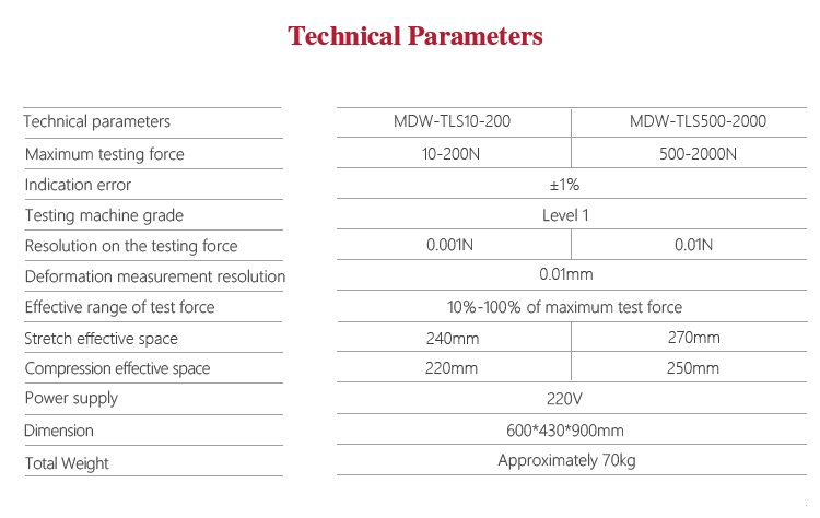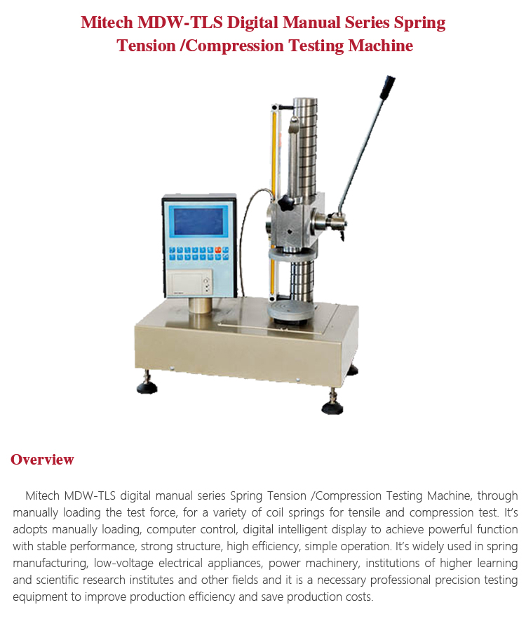 Product OverviewMitech MDW-TLS digital manual series Spring Tension /Compression Testing Machine, through manually loading the test force, for a variety of coil springs for tensile and compression test. It’s adopts manually loading, computer control, digital intelligent display to achieve powerful function with stable performance, strong structure, high efficiency, simple operation. It’s widely used in spring manufacturing, low-voltage electrical appliances, power machinery, institutions of higher learning and scientific research institutes and other fields and it is a necessary professional precision testing equipment to improve production efficiency and save production costs.