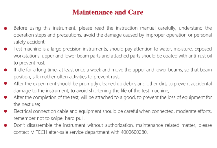 l Test machine is a large precision instruments, should pay attention to water, moisture. Exposed workstations, upper and lower beam parts and attached parts should be coated with anti-rust oil to prevent rust;