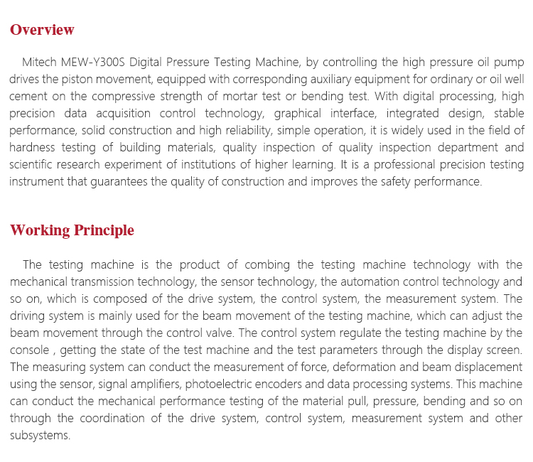 Product OverviewMitech MEW-Y300S Digital Pressure Testing Machine, by controlling the high pressure oil pump drives the piston movement, equipped with corresponding auxiliary equipment for ordinary or oil well cement on the compressive strength of mortar test or bending test. With digital processing, high precision data acquisition control technology, graphical interface, integrated design, stable performance, solid construction and high reliability, simple operation, it is widely used in the field of hardness testing of building materials, quality inspection of quality inspection department and scientific research experiment of institutions of higher learning. It is a professional precision testing instrument that guarantees the quality of construction and improves the safety performance.