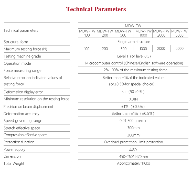 Product OverviewMitech MDW-TW micro control series Single-arm Spring Tension/Compression Testing Machine, through the single-chip automatic control motor driving screw movement, for a variety of coil springs for tensile and compression test. It’s adopts the built-in controller, AC servo motor, by computer-aided means to achieve powerful function with stable performance, strong structure, high reliability, simple operation, high degree of automation. Widely used in spring manufacturing, low-voltage electrical appliances, power machinery, institutions of higher learning and scientific research institutes and other fields.It is the necessary professional precision testing equipment for improving production efficiency and saving production costs.