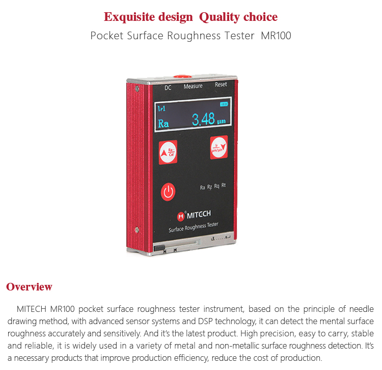 MITECH MR100 pocket surface roughness tester instrument, based on the principle of needle drawing method, with advanced sensor systems and DSP technology, it can detect the mental surface roughness accurately and sensitively. And it’s the latest product. High precision, easy to carry, stable and reliable, it is widely used in a variety of metal and non-metallic surface roughness detection. It’s a necessary products that improve production efficiency, reduce the cost of production.