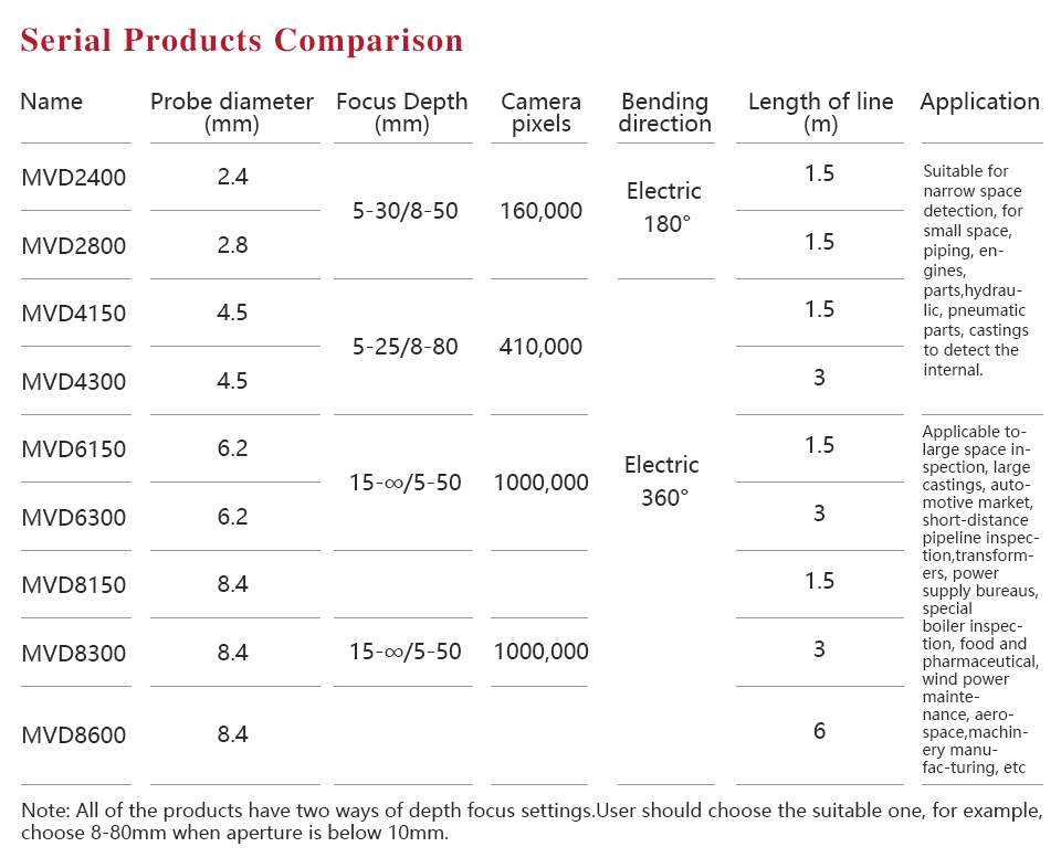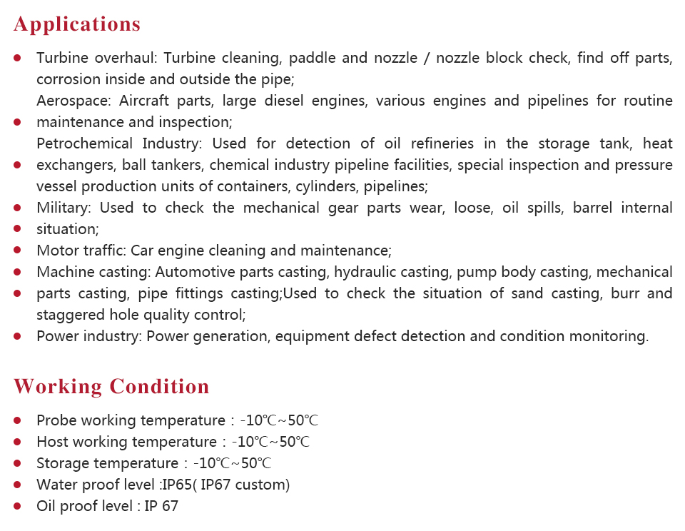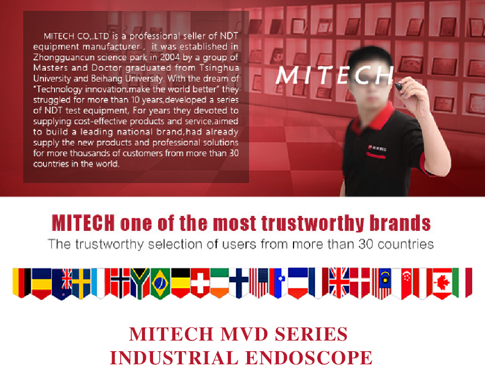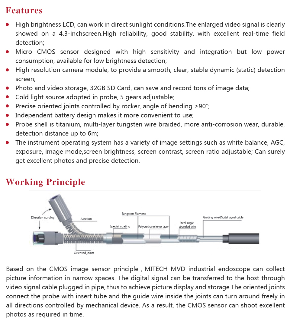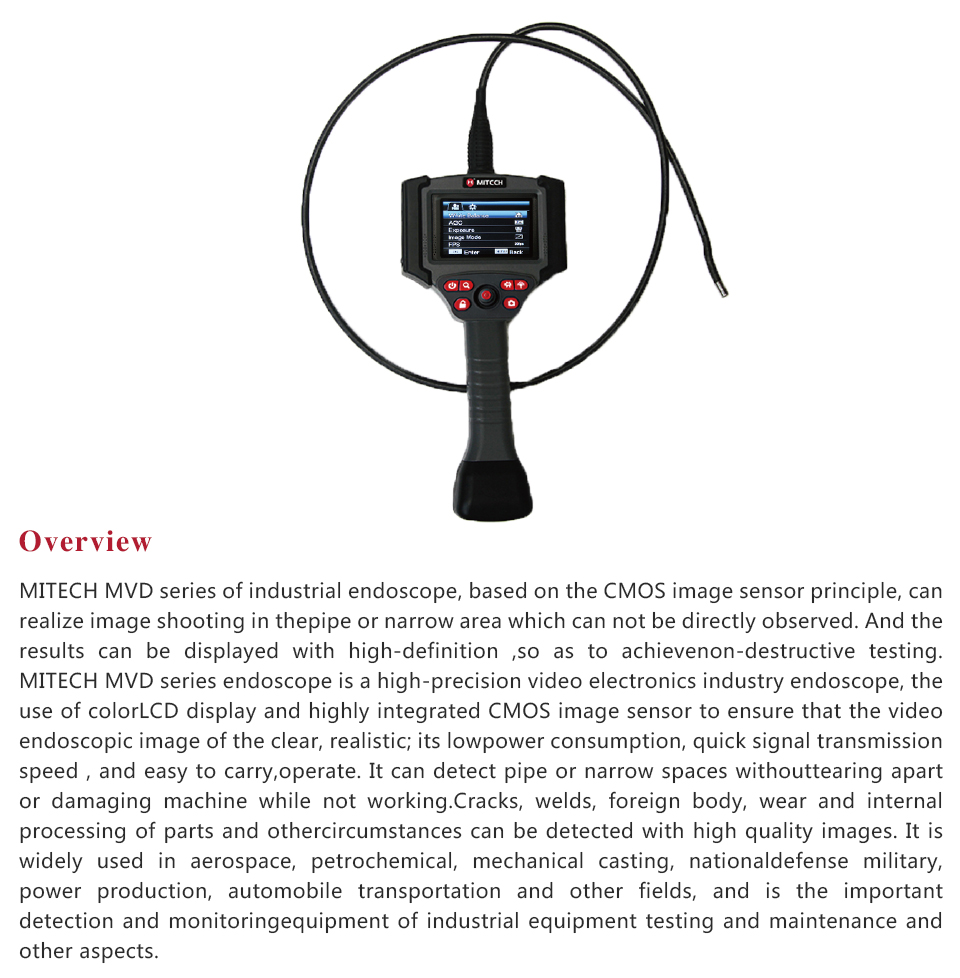 Product OverviewMITECH MVD series of industrial endoscope, based on the CMOS image sensor principle, can realize image shooting in the pipe or narrow area which can not be directly observed. And the results can be displayed with high-definition ,so as to achieve non-destructive testing. MITECH MVD series endoscope is a high-precision video electronics industry endoscope, the use of color LCD display and highly integrated CMOS image sensor to ensure that the video endoscopic image of the clear, realistic; its low power consumption, quick signal transmission speed , and easy to carry,operate. It can detect pipe or narrow spaces without tearing apart or damaging machine while not working.Cracks, welds, foreign body, wear and internal processing of parts and other circumstances can be detected with high quality images. It is widely used in aerospace, petrochemical, mechanical casting, national defense military, power production, automobile transportation and other fields, and is the important detection and monitoring equipment of industrial equipment testing and maintenance and other aspects.