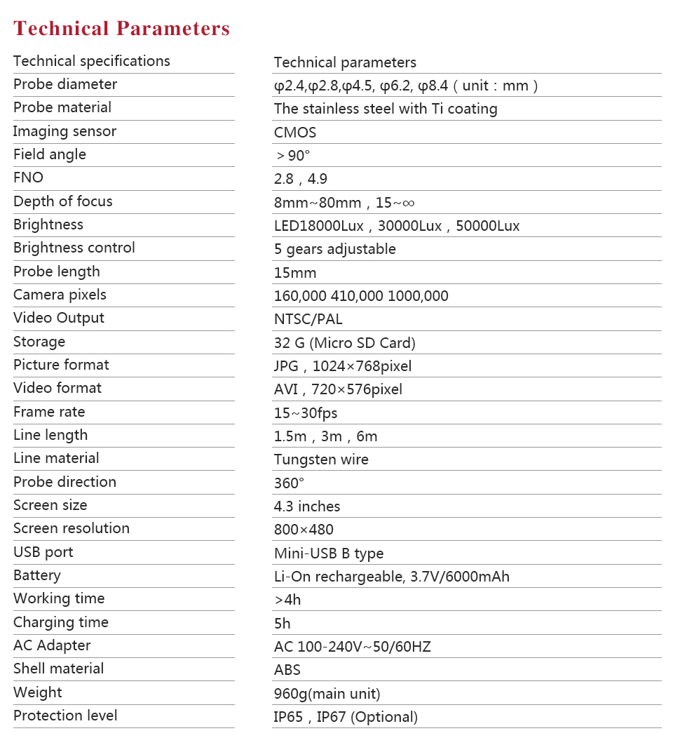 | Probe diameter | ?4.5, ?6.2, ?8.4(unit:mm) |