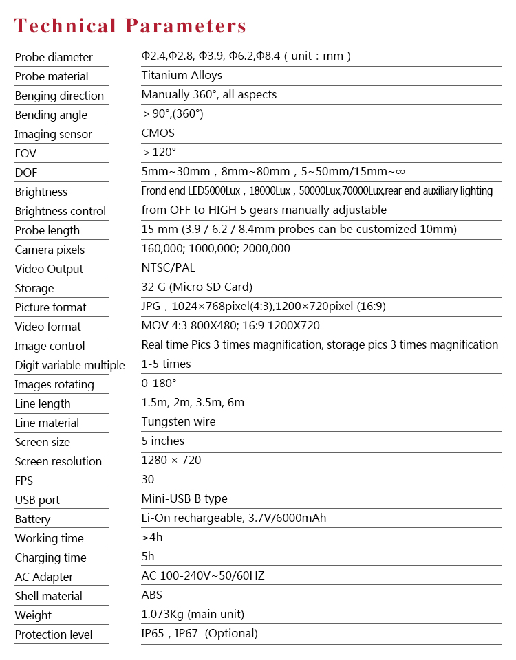 | Probe diameter | ?2.4, ?3.9, ?6,?8(unit:mm) |