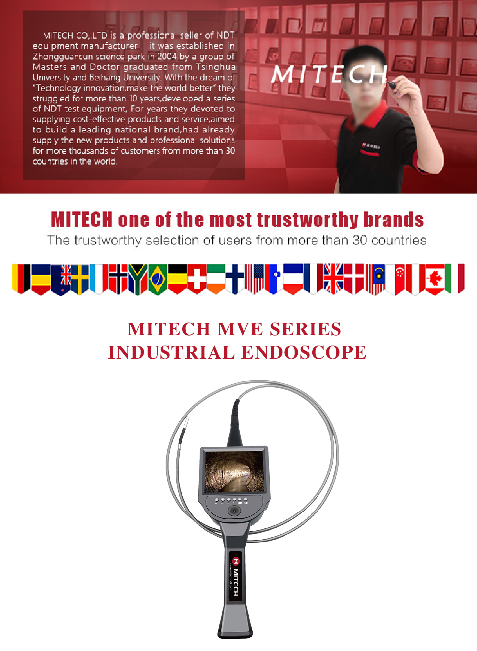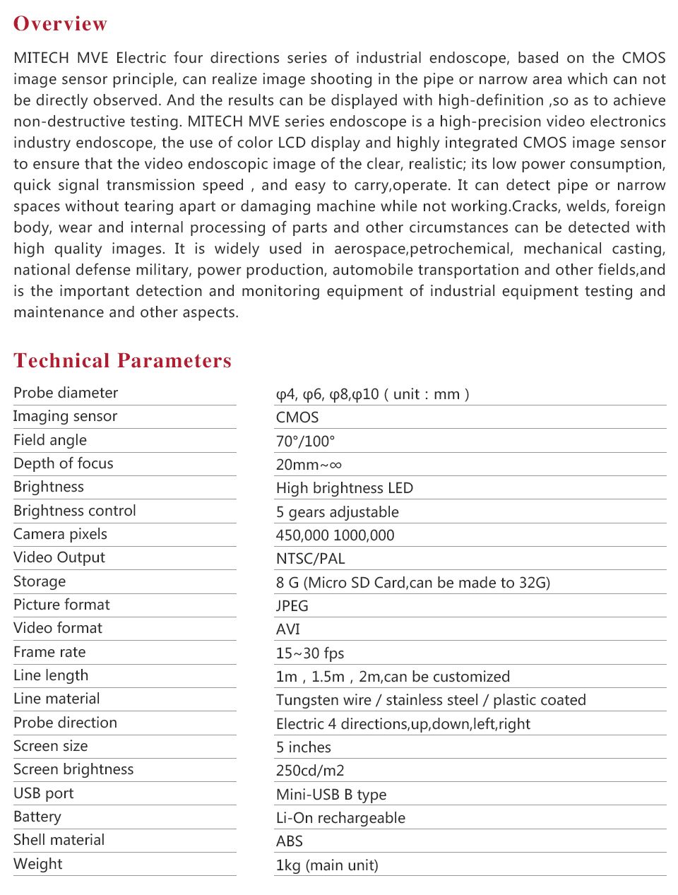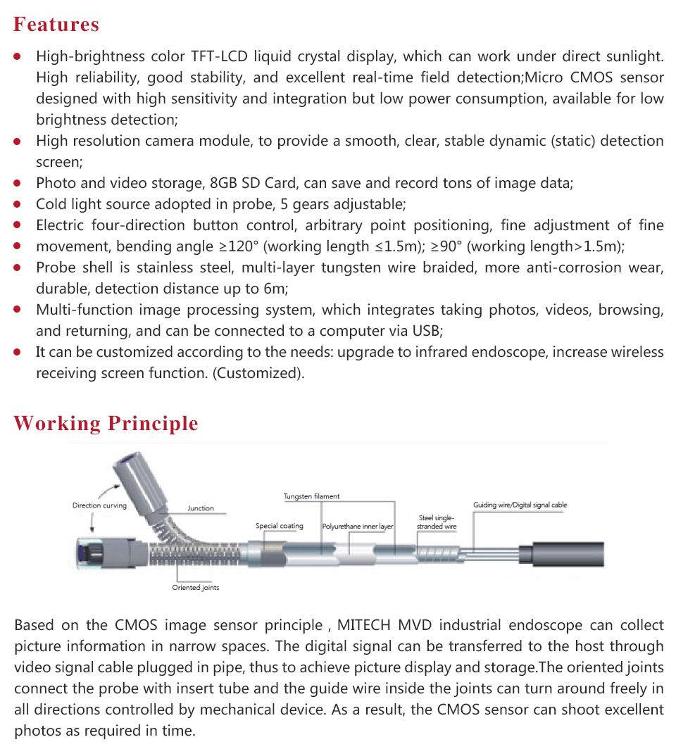 Product OverviewMITECH MVE Electric four directions series of industrial endoscope, based on the CMOS image sensor principle, can realize image shooting in the pipe or narrow area which can not be directly observed. And the results can be displayed with high-definition ,so as to achieve non-destructive testing. MITECH MVE series endoscope is a high-precision video electronics industry endoscope, the use of color LCD display and highly integrated CMOS image sensor to ensure that the video endoscopic image of the clear, realistic; its low power consumption, quick signal transmission speed , and easy to carry,operate. It can detect pipe or narrow spaces without tearing apart or damaging machine while not working.Cracks, welds, foreign body, wear and internal processing of parts and other circumstances can be detected with high quality images. It is widely used in aerospace, petrochemical, mechanical casting, national defense military, power production, automobile transportation and other fields, and is the important detection and monitoring equipment of industrial equipment testing and maintenance and other aspects.