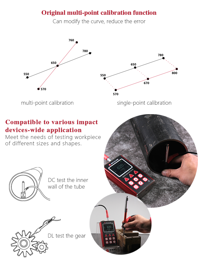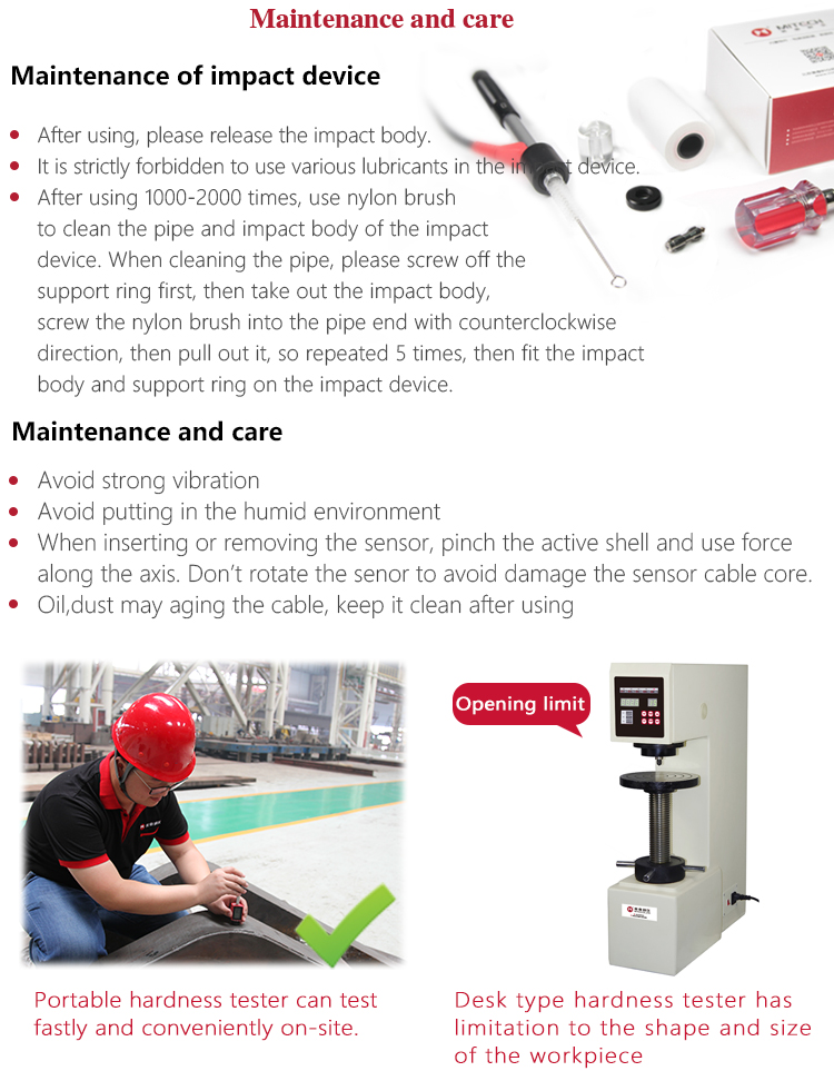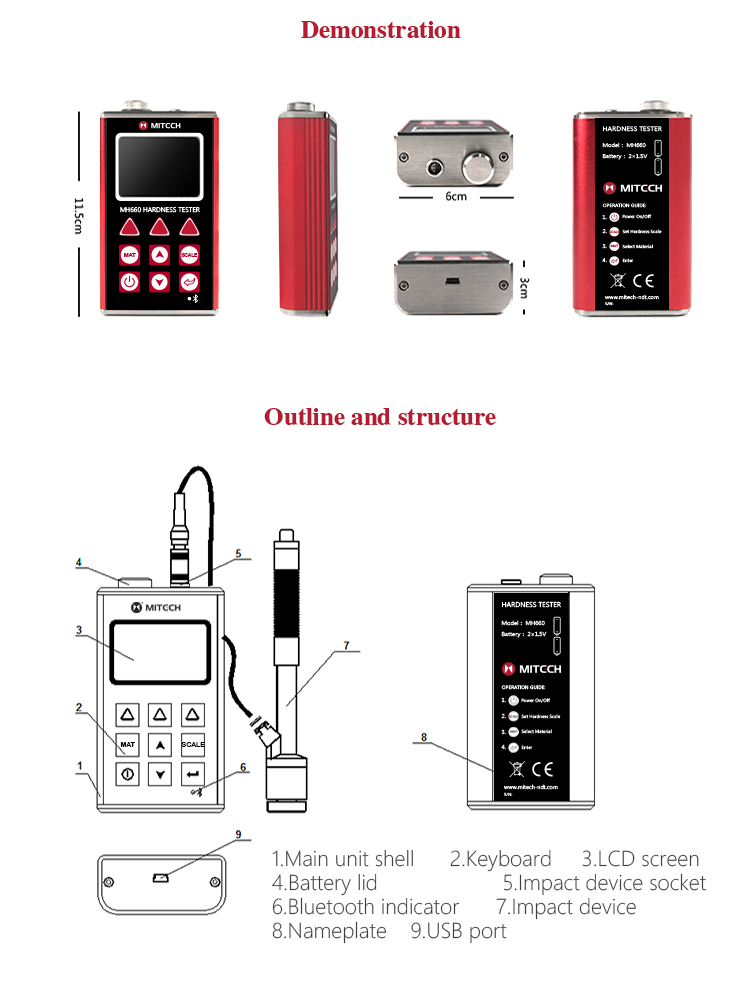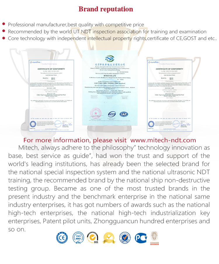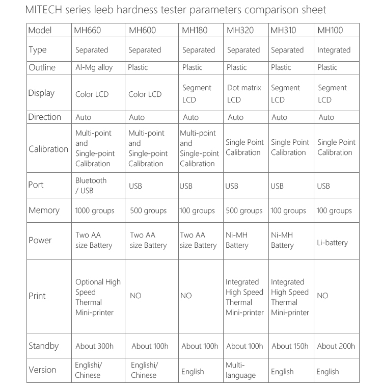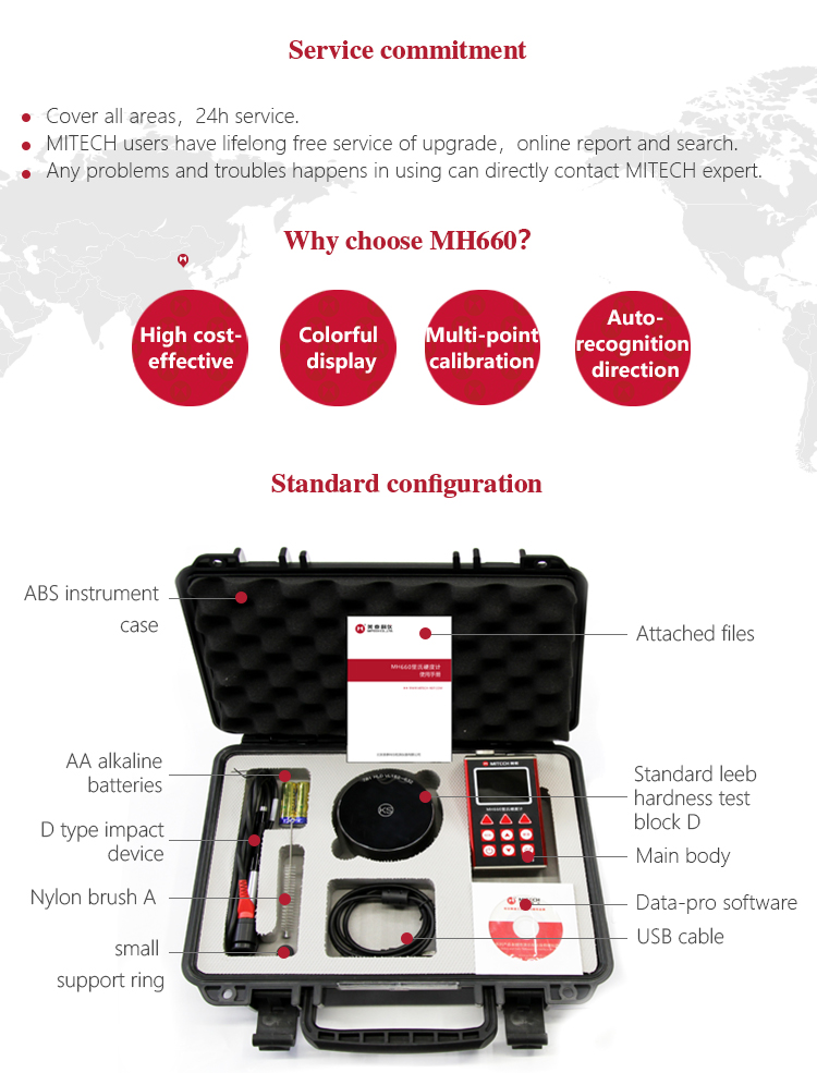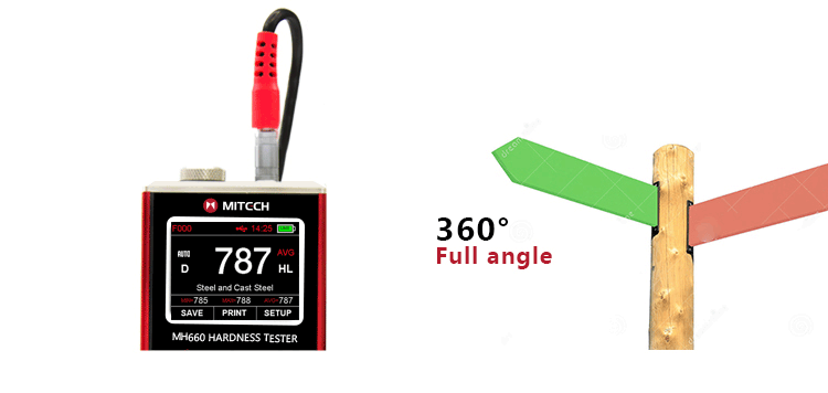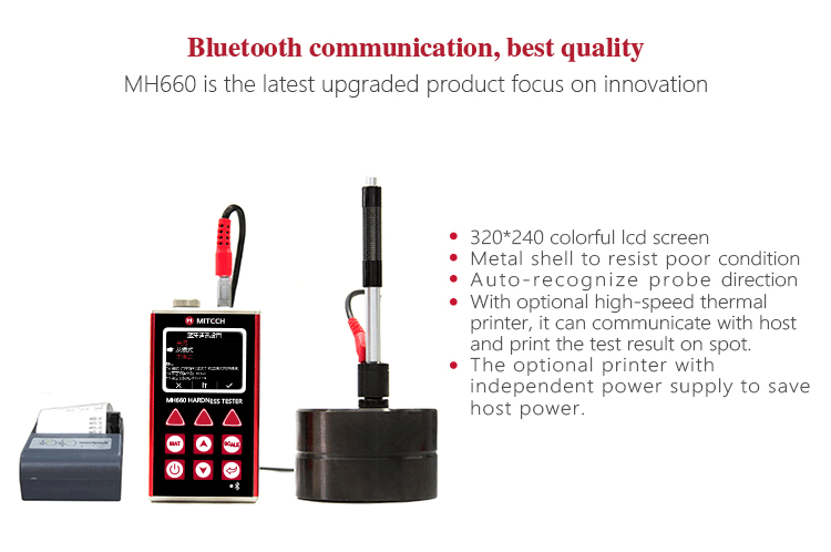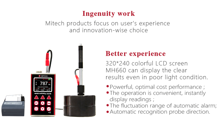 MH660 portable Leeb hardness tester is Mitech latest upgrade model, it focuses on user experience and innovative features. Using 320 × 240 color LCD display, can also present a clear measurement results in dim light and strong sunlight environment , greatly enhance the visual experience; sealed metal case compact design, smaller, better quality, designed to withstand harsh field environment of the oil, dust ,more original point calibration function is used to do multi-point calibration for convert curve to reduce errors;during measurement instrument can automatically identify the measuring direction, automatically alarm when out of range, to meet the inspection requirements with high precision and multi-angle material collected, support free conversion between hardness type; low-power design powered by two AA batteries, support multiple languages.Blue-tooth printer. It is widely used in metal processing and manufacturing, special equipment or permanent component failure analysis in service, inspection and other fields. Particularly suitable for large non-removable part of the site hardness testing. It is to improve the pass rate of production and cost savings necessary professional precision instrument.