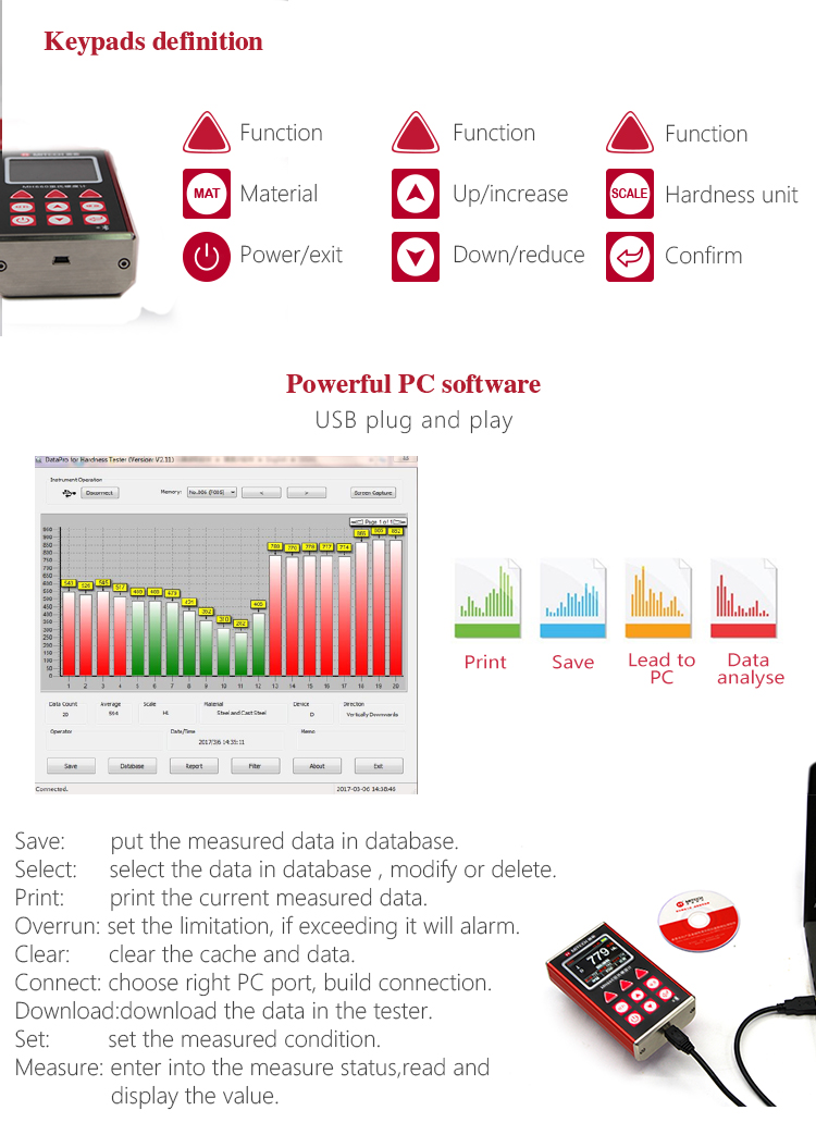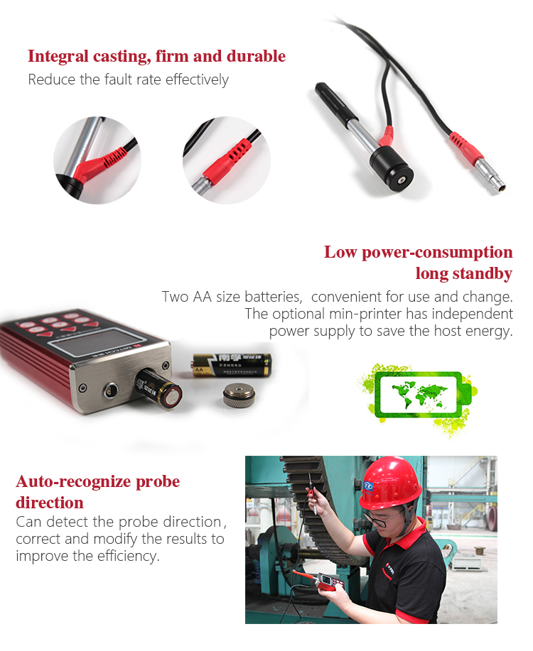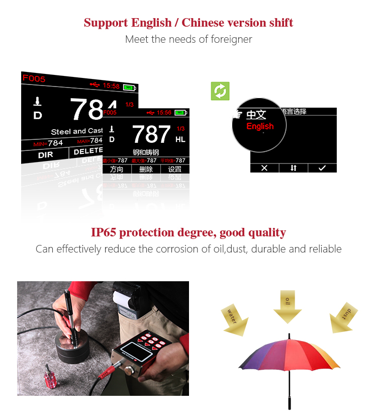It can store 500 groups (impact times 32 ~ 1) hardness values, each data includes single testing value, average value, measurement date / time, impact direction, frequency, material, hardness and other information.