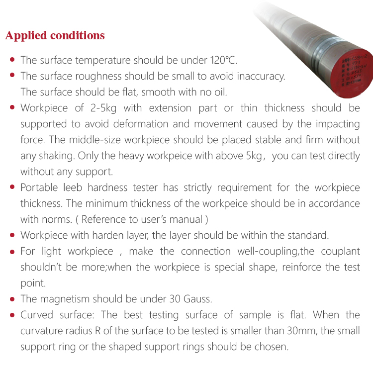---- If want accurate conversion from the Leeb hardness value to other hardness value, contrastive test is needed to get conversion relations for the special material. Use inspection qualified Leeb hardness tester and corresponding hardness tester to test at the same sample respectively. For each hardness value, each measure homogeneously 5 points of Leeb hardness value in the surrounding of more than three indentations which need conversion hardness, using Leeb hardness arithmetic average value and corresponding hardness average value as correlative value respectively, make individual hardness contrastive curve. Contrastive curve at least should include three group of correlative data.