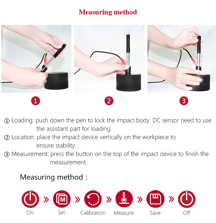 Working PrincipleThe basic principle is to use an impact body of certain weight impacts against the testing surface under certain test force, then measure the impacting velocity and the rebounding velocity of the impact body respectively when the spherically test tip is located 1mm above the testing surface.