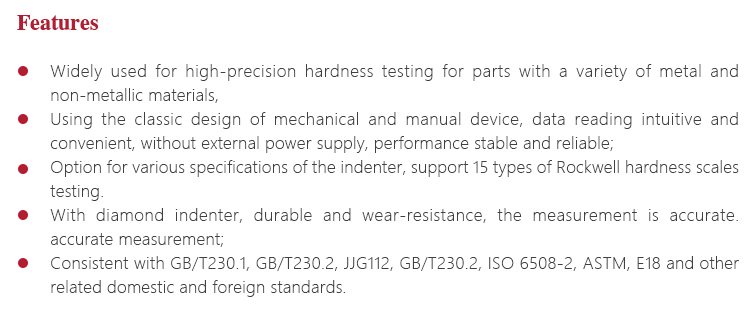 | Hardness Measuring range | HRA:20-88、HRB:20-100、HRC:20-70、HRD:40-77、HRE:70-100、 HRF:60-100、HRG:30-94、HRH:80-100、HRK:40-100 |