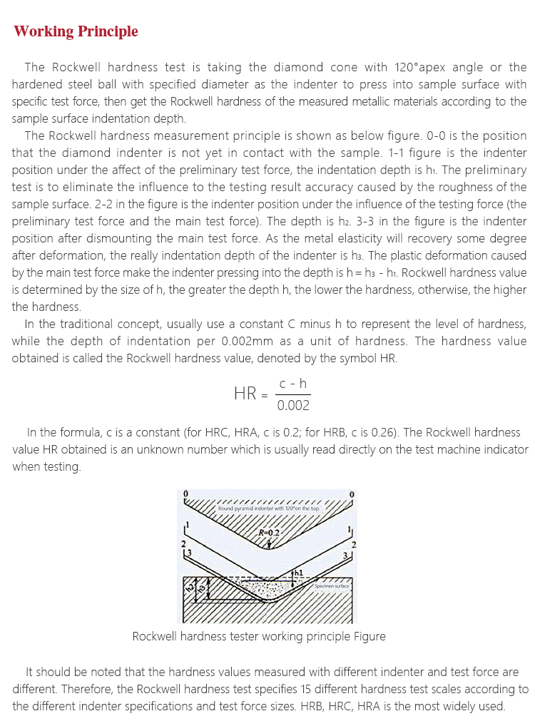 The Rockwell hardness measurement principle is shown as below figure. 0-0 is the position that the diamond indenter is not yet in contact with the sample. 1-1 figure is the indenter position under the affect of the preliminary test force, the indentation depth is h1. The preliminary test is to eliminate the influence to the testing result accuracy caused by the roughness of the sample surface. 2-2 in the figure is the indenter position under the influence of the testing force (the preliminary test force and the main test force). The depth is h2. 3-3 in the figure is the indenter position after dismounting the main test force. As the metal elasticity will recovery some degree after deformation, the really indentation depth of the indenter is h3. The plastic deformation caused by the main test force make the indenter pressing into the depth is h=h3-h1. Rockwell hardness value is determined by the size of h, the greater the depth h, the lower the hardness, otherwise, the higher the hardness.