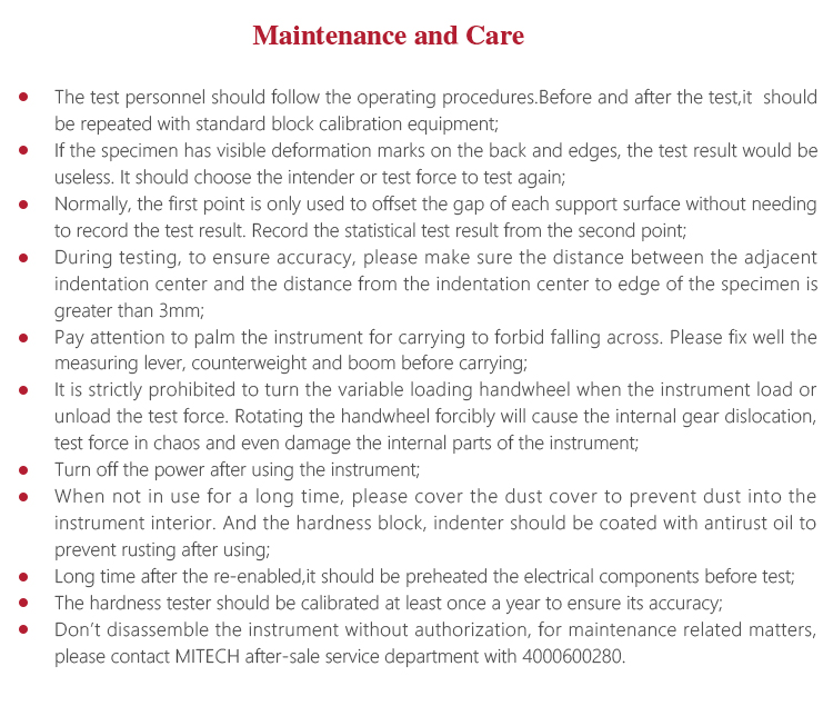 l The hardness tester should be calibrated at least once a year to ensure its accuracy;