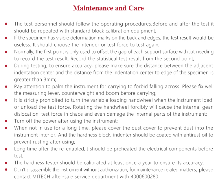 l The hardness tester should be calibrated at least once a year to ensure its accuracy;