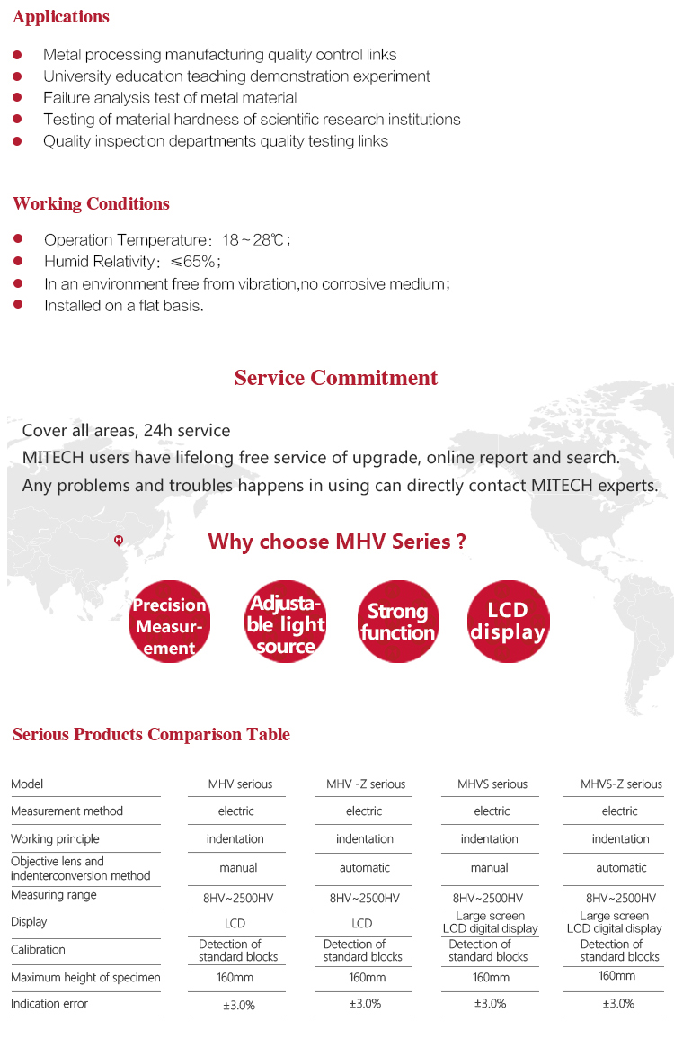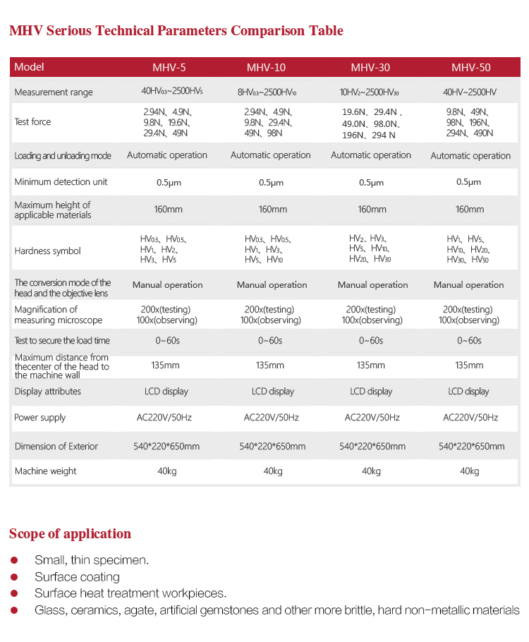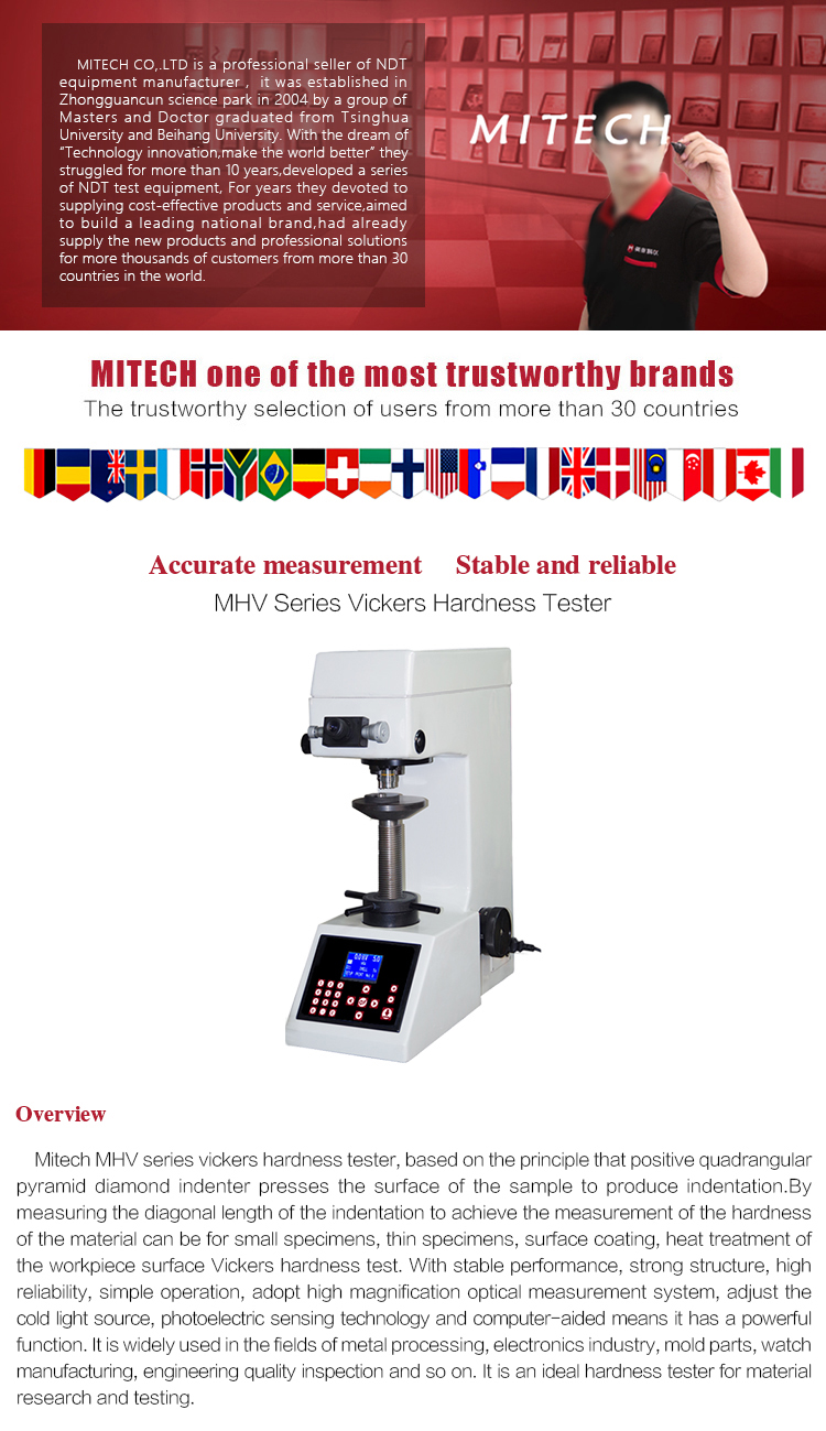 Product OverviewMitech MHV series vickers hardness tester, based on the principle that positive quadrangular pyramid diamond indenter presses the surface of the sample to produce indentation.By measuring the diagonal length of the indentation to achieve the measurement of the hardness of the material can be for small specimens, thin specimens, surface coating, heat treatment of the workpiece surface Vickers hardness test. With stable performance, strong structure, high reliability, simple operation, adopt high magnification optical measurement system, adjust the cold light source, photoelectric sensing technology and computer-aided means it has a powerful function. It is widely used in the fields of metal processing, electronics industry, mold parts, watch manufacturing, engineering quality inspection and so on. It is an ideal hardness tester for material research and testing.