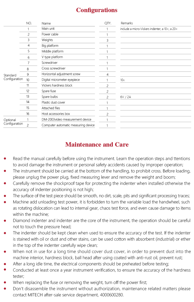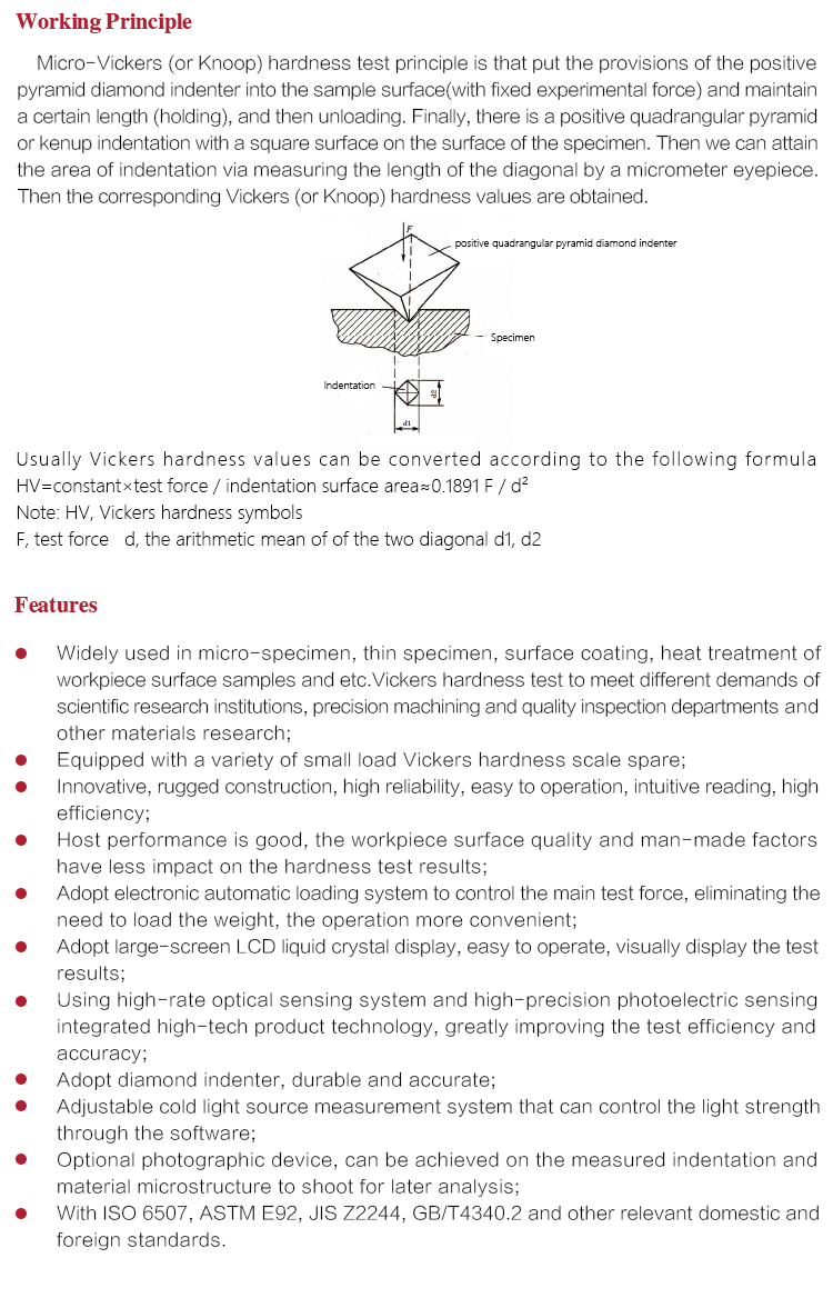 Instrument FeaturesWidely used in micro-specimen, thin specimen, surface coating, heat treatment of workpiece surface samples and etc.Vickers hardness test to meet different demands of scientific research institutions, precision machining and quality inspection departments and other materials research;