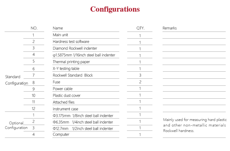 | Indentor specification | Diamond cone Rockwell indenter, Φ1.5875mm steel ball indenter |