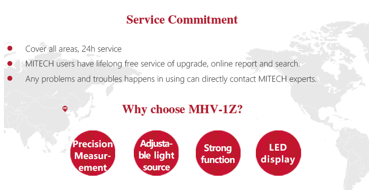 Product OverviewMitech MHV-1Z automatic turret micro hardness tester, based on the principle that positive quadrangular pyramid diamond indenter presses the surface of the sample to produce indentation.By measuring the diagonal length of the indentation to achieve the measurement of the hardness of the material can be for small specimens, thin specimens, surface coating, heat treatment of the workpiece surface Vickers hardness test. With stable performance, strong structure, high reliability, simple operation, adopt high magnification optical measurement system, adjust the cold light source, photoelectric sensing technology and computer-aided means it has a powerful function. It is widely used in the fields of metal processing, electronics industry, mold parts, watch manufacturing, engineering quality inspection and so on. It is an ideal hardness tester for material research and testing.