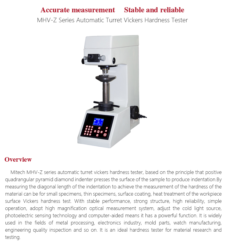 Product OverviewMitech MHV-Z series automatic turret vickers hardness tester, based on the principle that positive quadrangular pyramid diamond indenter presses the surface of the sample to produce indentation.By measuring the diagonal length of the indentation to achieve the measurement of the hardness of the material can be for small specimens, thin specimens, surface coating, heat treatment of the workpiece surface Vickers hardness test. With stable performance, strong structure, high reliability, simple operation, adopt high magnification optical measurement system, adjust the cold light source, photoelectric sensing technology and computer-aided means it has a powerful function. It is widely used in the fields of metal processing, electronics industry, mold parts, watch manufacturing, engineering quality inspection and so on. It is an ideal hardness tester for material research and testing.