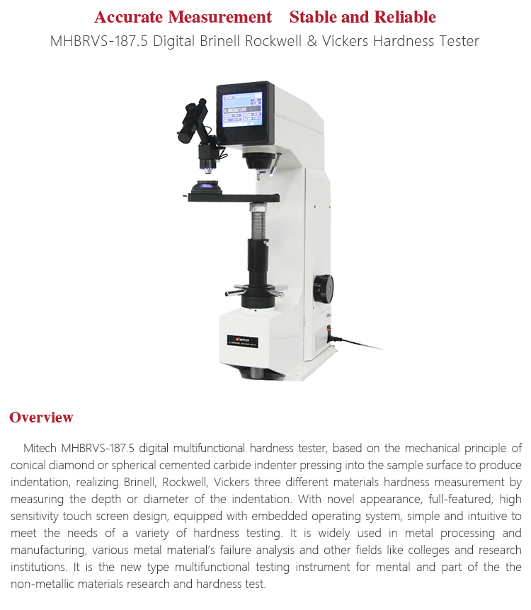 Product OverviewMitech MHBRVS-187.5 digital multifunctional hardness tester, based on the mechanical principle of conical diamond