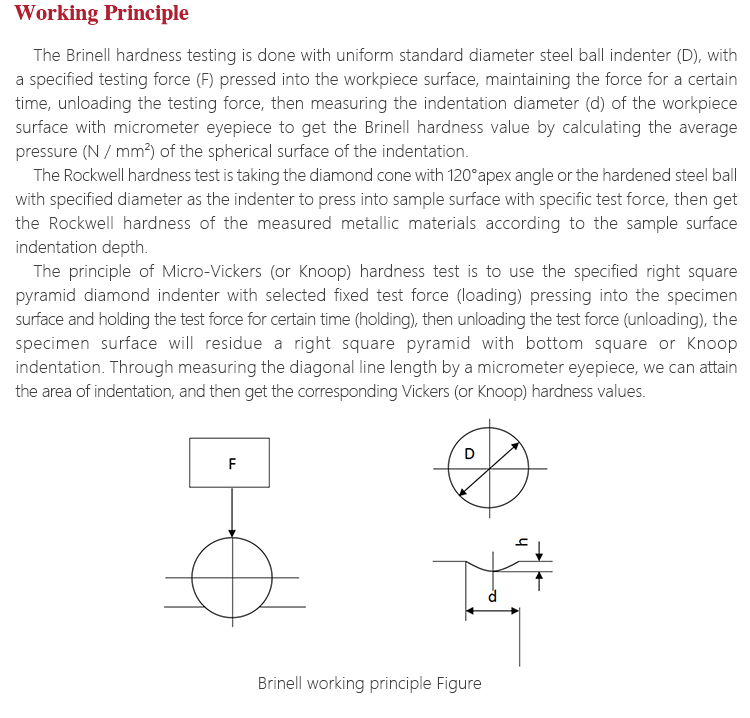 Working PrincipleBrinell hardness test: Test force(F) is on the steel ball with certain diameter(D) , pressed on sample surface. After a period of time, cancel the force. The indentation diameter is get by measuring with micrometer ocular,thus to calculate the average pressure(N/mm2).Then we can get the Brinell hardness.