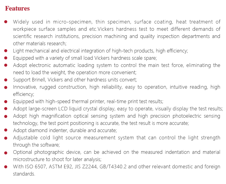 Instrument FeatureslWidely used in micro-specimen, thin specimen, surface coating, heat treatment of workpiece surface samples and etc.Vickers hardness test to meet different demands of scientific research institutions, precision machining and quality inspection departments and other materials research;