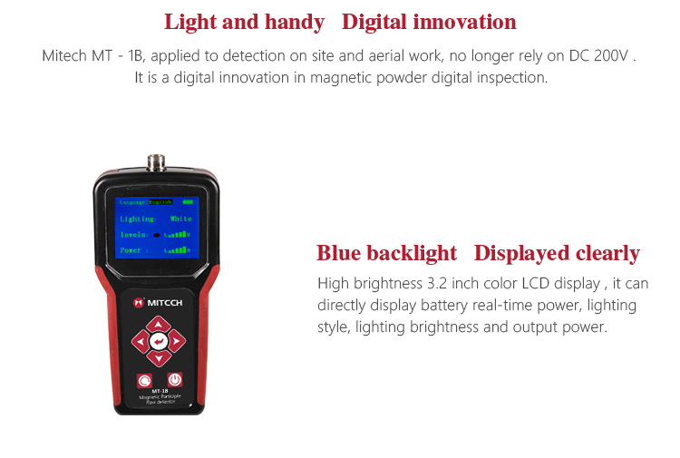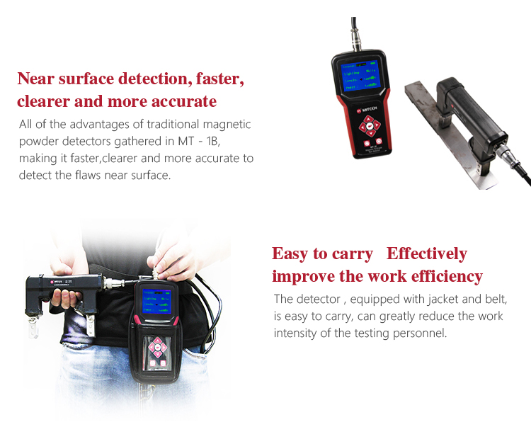 MITECH magnetic detectors pockets and belts, portable compact, the operator can tilt the instrument across the waist, greatly reducing the labor intensity of the flaws, improve work efficiency, especially for the field, high altitude testing and other special occasions flaw detection.