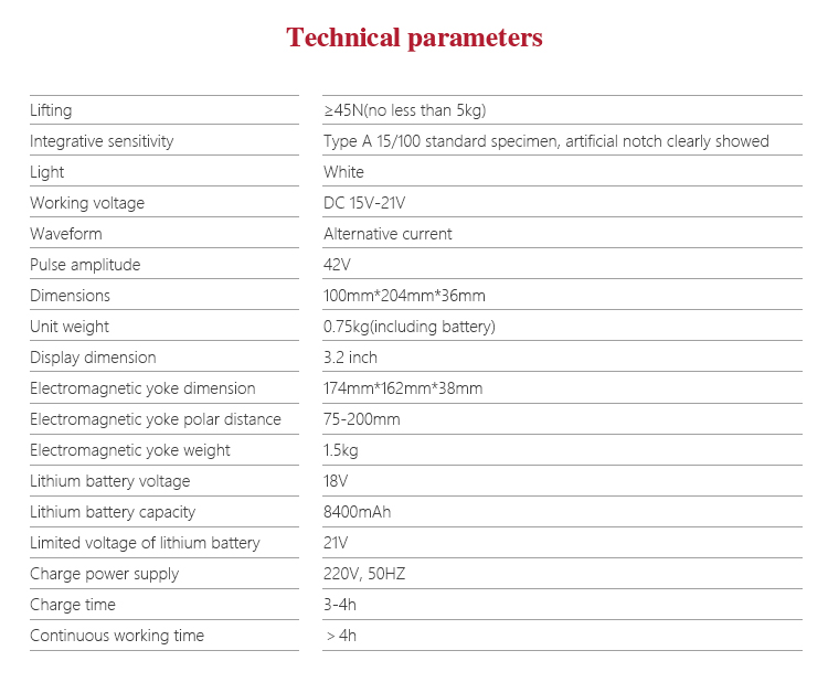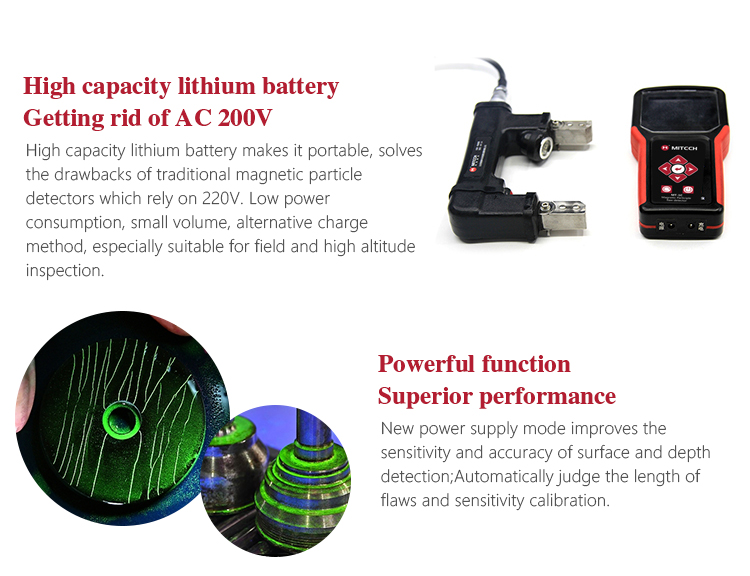 l High capacity lithium battery makes it portable, solves the drawbacks of traditional, magnetic particle detector relying on 220V. Low power consumption, small volume, alternative charge method, especially suitable for field and high altitude inspection.