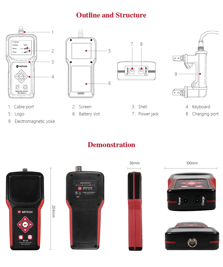MITECH Portable Magnetic Flaw Detector Electromagnetic Yoke,Size: 174mm * 162mm * 38mm, Electromagnetic yoke distance: 75-200mm, Electromagnetic yoke Weight: 1.5kg.The use of pulsating power supply technology, continuous uninterrupted work, from the traditional electromagnetic yoke must be the gap time limit. At the same time lighting brightness, power, yoke spacing adjustable to meet your needs of different measurement conditions.