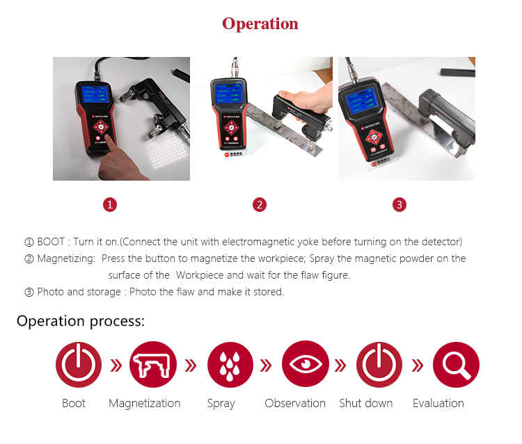 Put the workpiece into high-intensity magnetic field, connect electric to make it magnetized, if there are flaws (crack,slag) in or near the surface, there will be a leakage around the flaws. Put good quality magnetic powder(usually the magnetic iron oxide powder)on the object, magnetic powder will gather together near the leaked magnetic field, piled up to form visible traces of magnetic powder. In the proper light, we can see the marks and judge the position, size, shape and degree of the flaws.