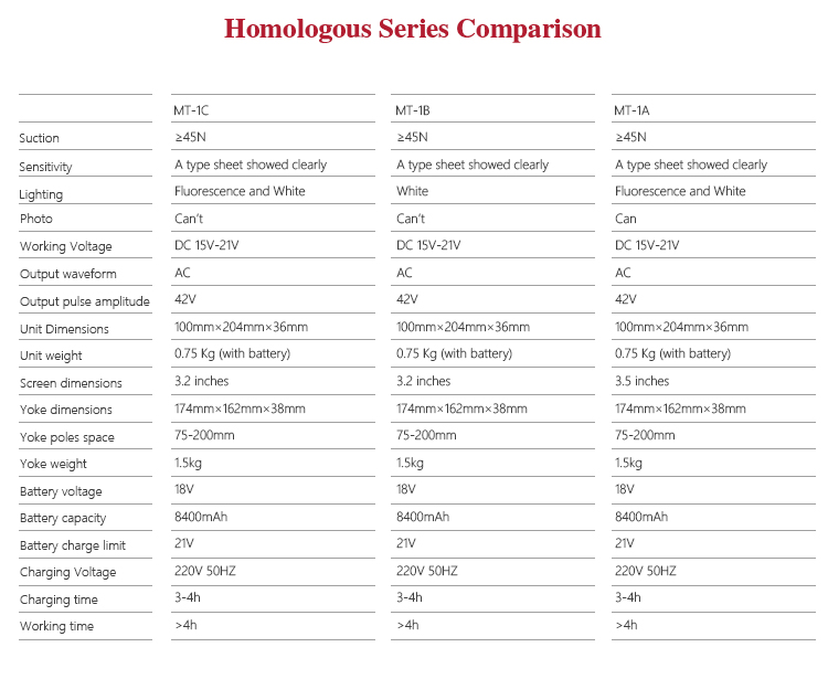 MT-1B magnetic particle flaw detector adapts high-capacity lithium battery pack, converse DC to AC through variable-frequency, providing magnetic powder flaw detector with magnetic power supply. With low power consumption, it can continuous work more than four hour after charging. It especially suits for working in the wild and aerial area.