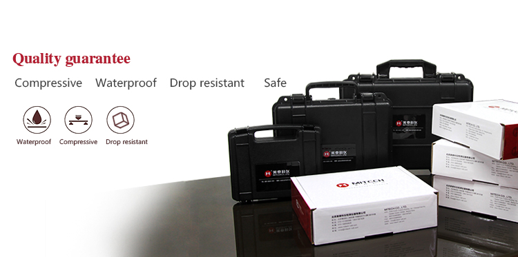 MITECH portable Leeb hardness tester box, length: 35.5cm; width: 19cm; high: 11cm; weight: 1.5kg. It is made of ABS plastic, which is waterproof and resistant to shock. It has excellent heat resistance, low temperature resistance and so on. It can effectively protect the oil, dust and various kinds of corrosion in harsh environment. The box size is in line with aviation, (Can be placed under the seat and luggage rack), safe, reliable and stable.