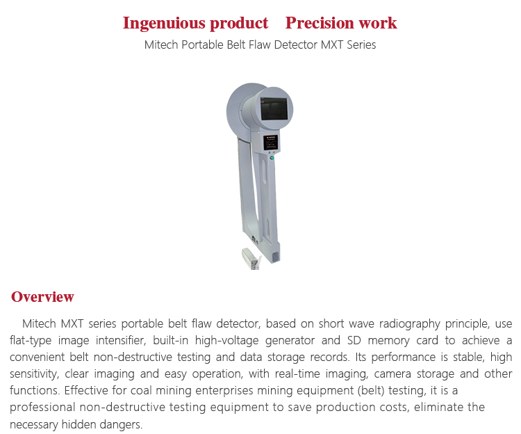 Mitech MXT series portable belt flaw detector, based on short wave radiography principle, use flat-type image intensifier, built-in high-voltage generator and SD memory card to achieve a convenient belt non-destructive testing and data storage records. Its performance is stable, high sensitivity, clear imaging and easy operation, with real-time imaging, camera storage and other functions. Effective for coal mining enterprises mining equipment (belt) testing, it is a professional non-destructive testing equipment to save production costs, eliminate the necessary hidden dangers.