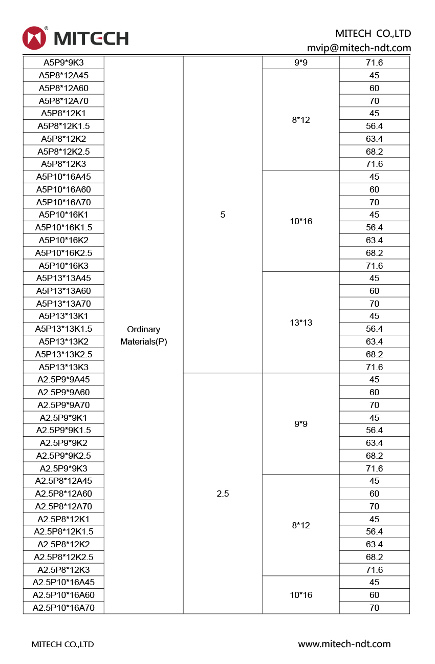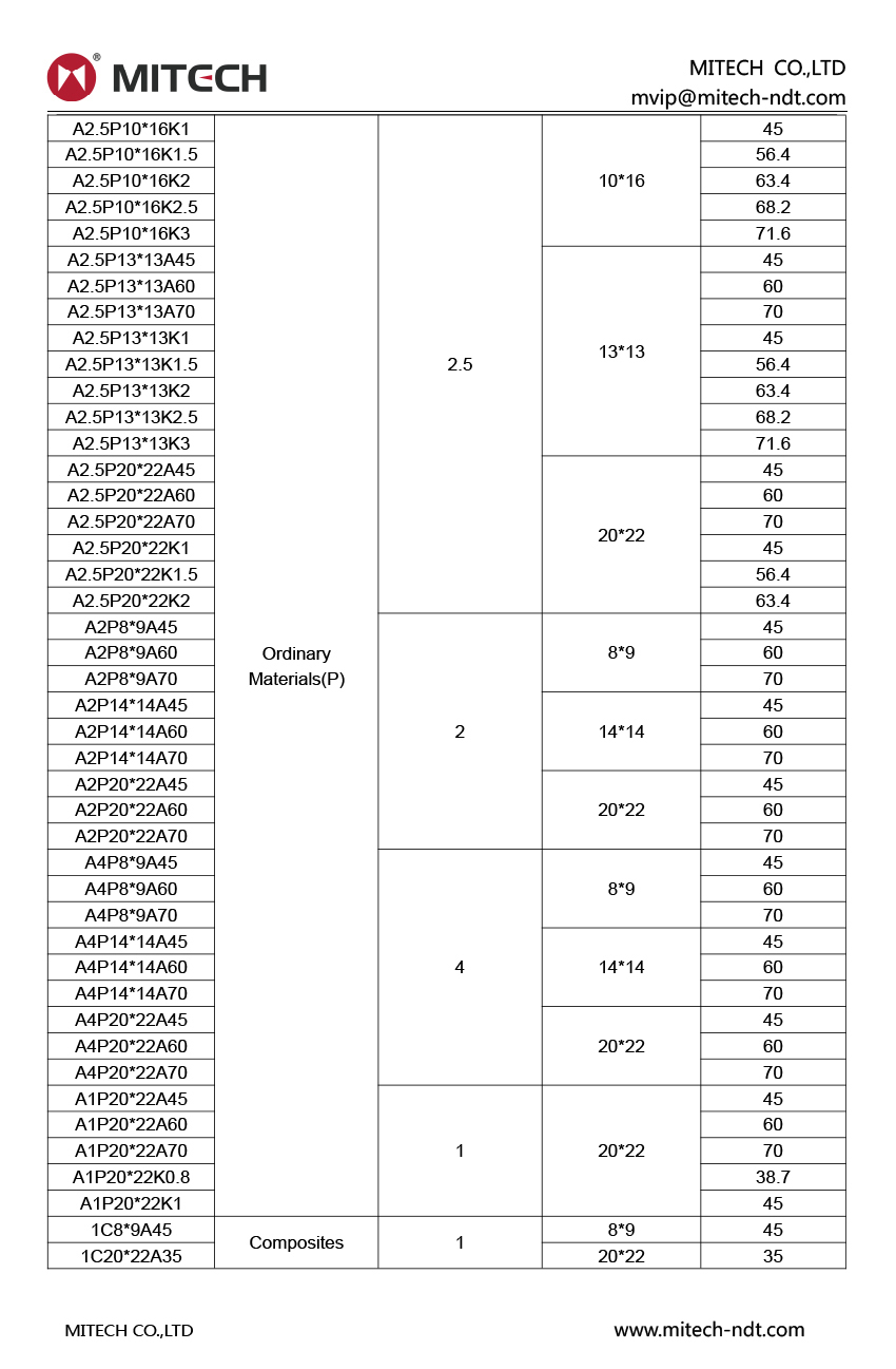 Mitech ultrasonic Angle Beam probe, choice superior performance of the piezoelectric material chip, damping block and protective film. Strong penetration, high signal to noise ratio, has good wear resistance, excellent near surface resolution, smaller scattering noise. The key manufacturing processes using special equipment and fixtures, as far as possible to exclude the impact of human factors.We can provide high-quality customized solutions to meet the special needs of customers. Angle beam probe is suitable for for welding and other conventional flaw detection, and widely used in a variety of pipe fittings, pressure vessels, axles and other manufacturing industries. Consistent with "EN12668-2" and other relevant standards at domestic and abroad, compatible with a variety of BNC (Q9),Microdot (L5) GB, American standard connector and LEMO-00 (C5), LEMO-1 (C9)and other European standard connector.