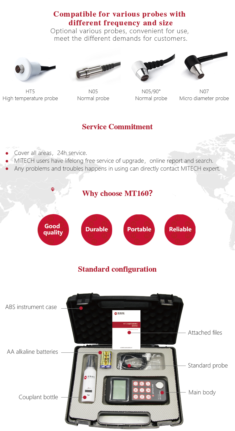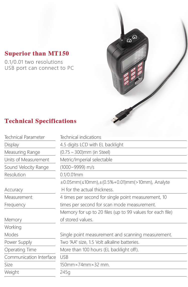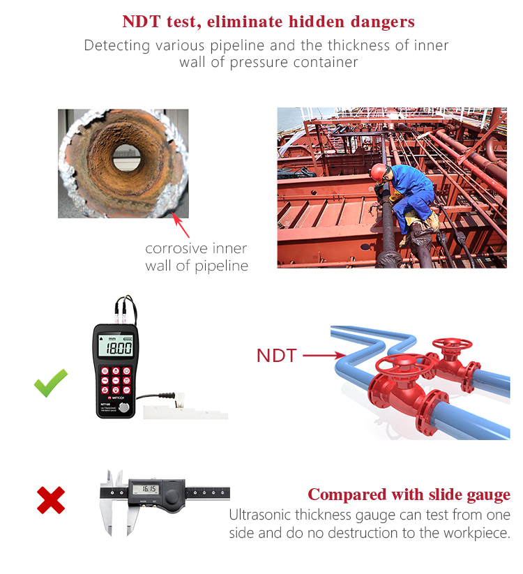 Product OverviewThe model MT160 is a digital ultrasonic thickness gauge .Based on the principle of ultrasonic principle, the instrument is capable of measuring the thickness of various materials, such as metal, plastic, ceramic, glass and many other good ultrasonic conductors. It of all kinds of materials. Compared with the traditional measurement methods, the advantages of ultrasonic thickness gauge is exposed to one side of the workpiece to complete the measurement. Its unique non-destructive testing performance provide the perfect solution for the thickness testing of closed pipes, containers, etc. It is widely used in pertroleum , chemical ,metallurgy, shipbuilding, aviation, aerospace and other fields because of monitoring corrosion thinning degree of various pipes and pressure vessels. It can also be used for precise measurement of sheet metal and machined parts.