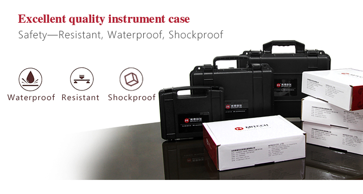 The instrument case of Mitech ultrasonic thickness gauge, length: 27cm, width: 22.5cm, height: 7.5cm and weight: 0.698kg, designed with ABS engineering plastic, It has excellent performance like waterproof, shockproof, excellent heat resistance and low temperature resistance. It can effectively prevent oil, dust and corrosion in harsh environment. Its size in line with the standards for aviation and train carrying (capable of putting under the seat and on the luggage rack), it is safe, reliable and stable.