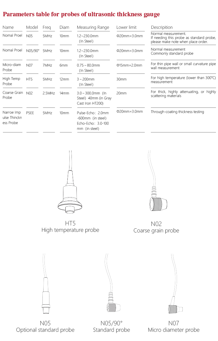 | Probe Diameter | Standard N05 is10MM、Probe N07 is 6MM、Probe HT5 is12MM、Probe N02 is12MM |