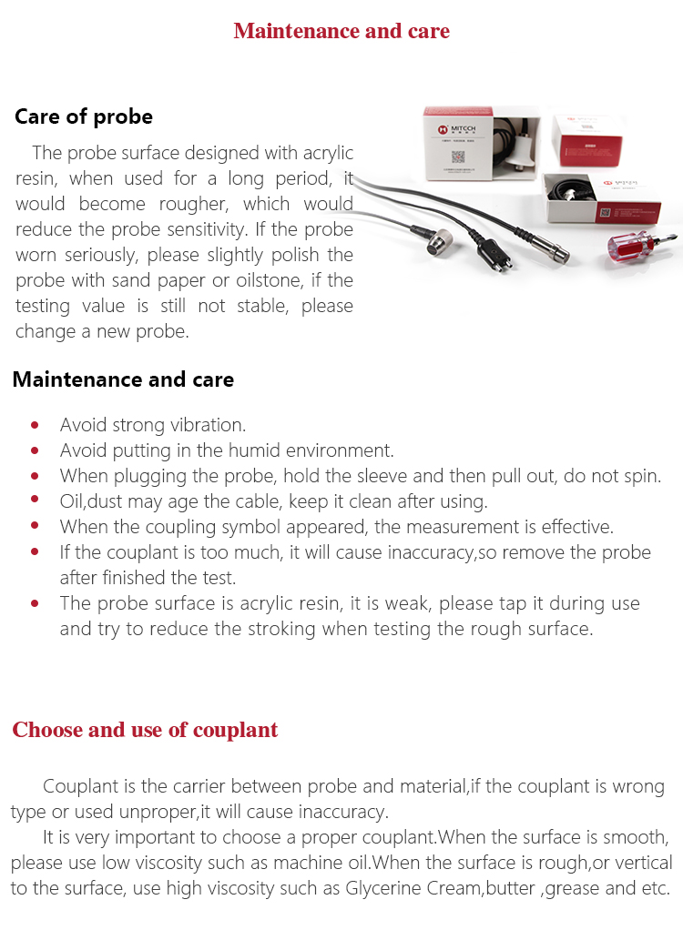 The couplant coated on the probe and the measured workpiece surface as the medium to isolate the air between them, selecting the proper viscosity couplant is the critical thing for the precisely measurement. Mitech series ultrasonic thickness gauge standard 75mm ultrasonic special couplant in the configuration for isolating the air between the ultrasonic probe and the workpiece surface, which can make probe produced ultrasonic wave into the workpiece effectively to ensure the accurate measurement of thickness. The couplant with squeeze bottle packing, it is clean and environmental. It is recommended to select the low viscosity couplant for measuring the smooth material and select the high viscosity couplant (like glycerine cream, butter and so on) for measuring the rough material.