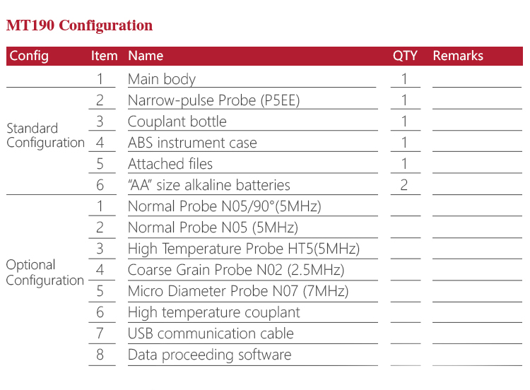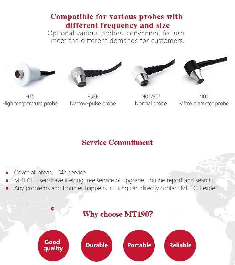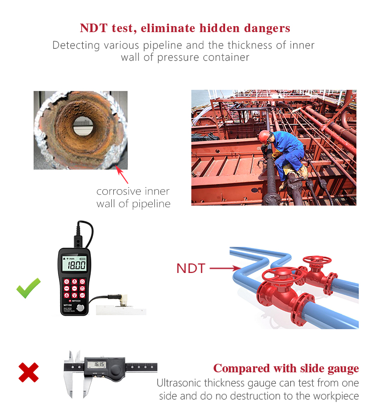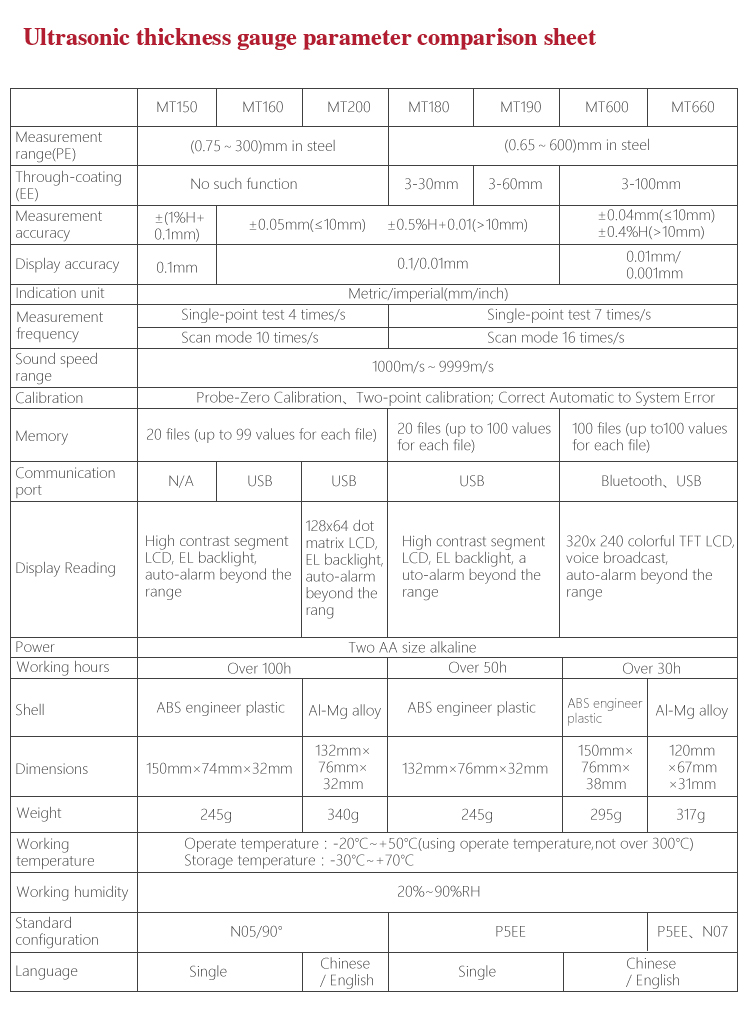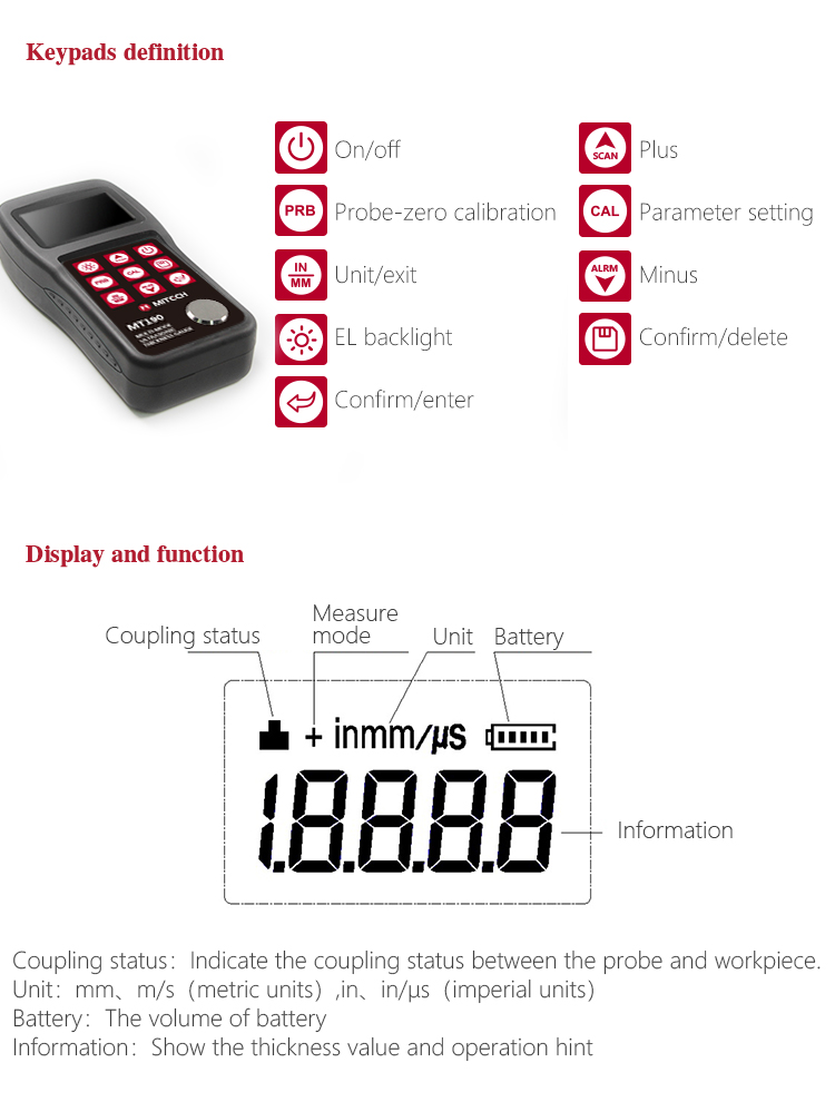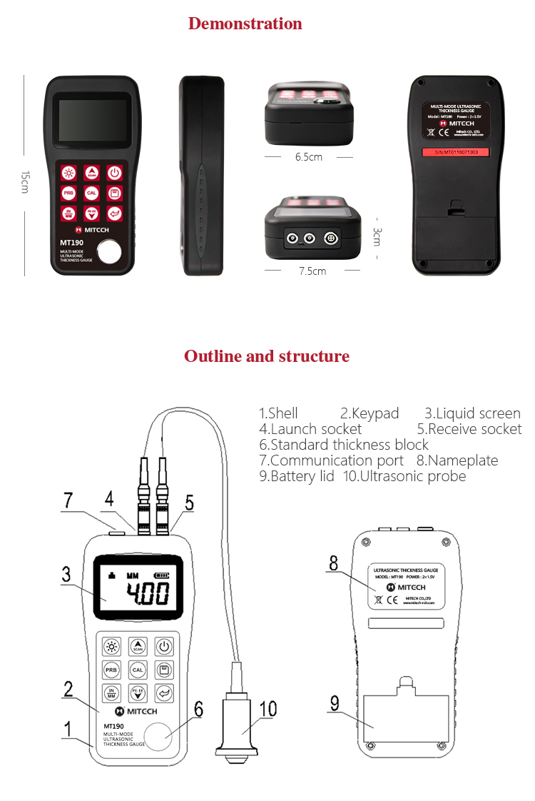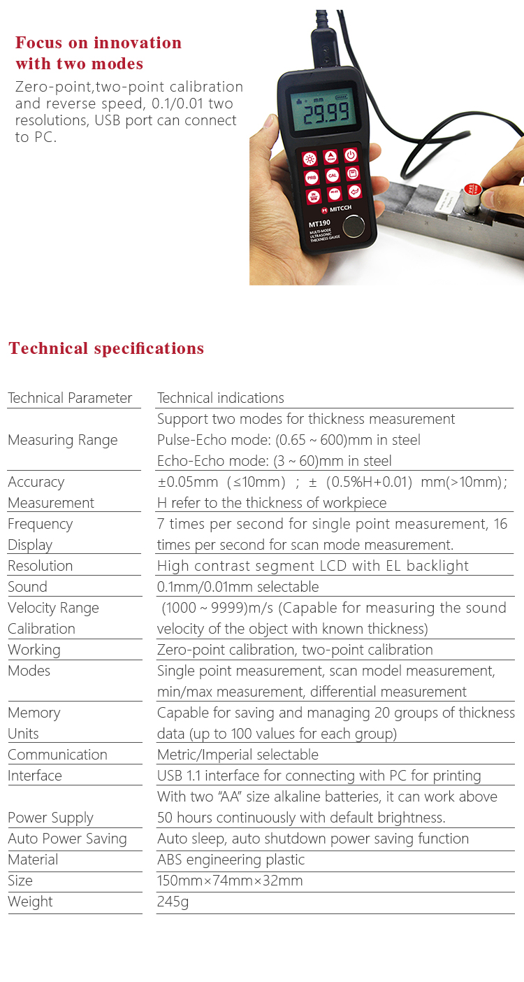 Product OverviewMiteh MT190 multi-mode ultrasonic thickness gauge, based on ultrasonic measuring principle, it can perform thickness measurements on a wide range of materials including metals, plastic, ceramics glass and other ultrasonic well-conductive materials. It is also capable for measuring the sound velocity of the object with known thickness. Compared with the traditional measurement method, the advantage of ultrasonic thickness gauge is that it can finish the measurement only if it contacts with one side of the measured workpiece. Its unique performance of capable for testing thickness through the coating provides efficient solution for testing the workpiece of coated surface or corrosion materials. It can test the workpiece directly without needing to get rid of the surface coating. It’s widely used for monitoring the production equipments’ various pipelines and pressure vessel corrosion reducing degree in the fields of petroleum, chemical, metallurgy, shipbuilding, aviation, aerospace and so on. It also can be used for making accurate measurement to various plates and machining parts. It is the necessary professional precision instrument for improving the production efficiency and qualification rate as well as saving cost.
