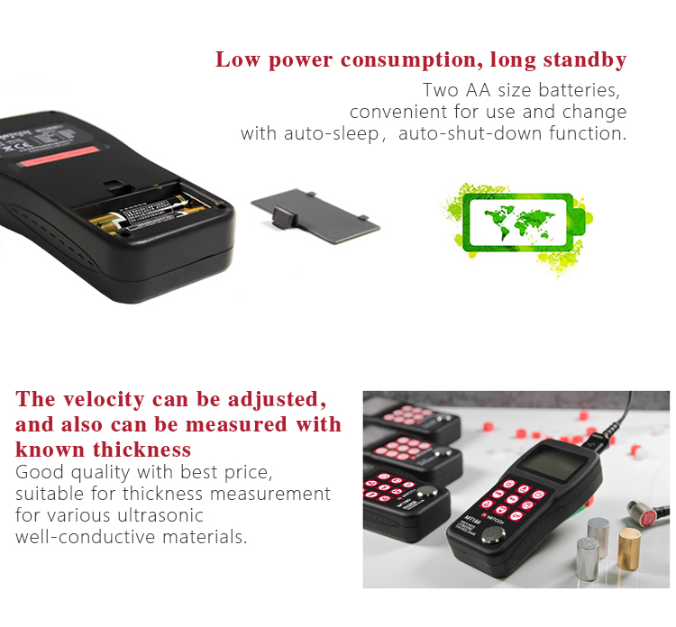 Mitech series ultrasonic thickness gauges, with low-power design and long standby, MT150/MT160/MT200/MT180/MT190/MT600/MT660 are with two AA size alkaline batteries for power supply, easy to replace.