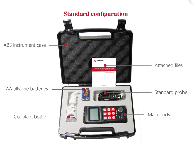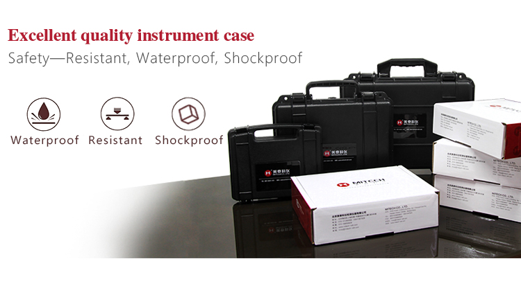 The instrument case of Mitech ultrasonic thickness gauge, length: 27cm, width: 22.5cm, height: 7.5cm and weight: 0.698kg, designed with ABS engineering plastic, It has excellent performance like waterproof, shockproof, excellent heat resistance and low temperature resistance. It can effectively prevent oil, dust and corrosion in harsh environment. Its size in line with the standards for aviation and train carrying (capable of putting under the seat and on the luggage rack), it is safe, reliable and stable.