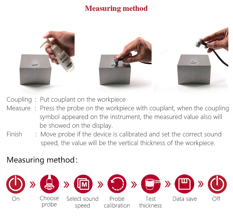 The velocity of sound through a substance is dependant upon its temperature. As materials heat up, the velocity of sound through them decreases. In most applications with surface temperatures less than about 100℃, no special procedures must be observed. At temperatures above this point, the change in sound velocity of the material being measured starts to have a noticeable effect upon ultrasonic measurement. At such elevated temperatures, it is recommended that the user perform a calibration procedure on a sample piece of known thickness, which is at or near the temperature of the material to be measured. This will allow the gauge to correctly calculate the velocity of sound through the hot material.